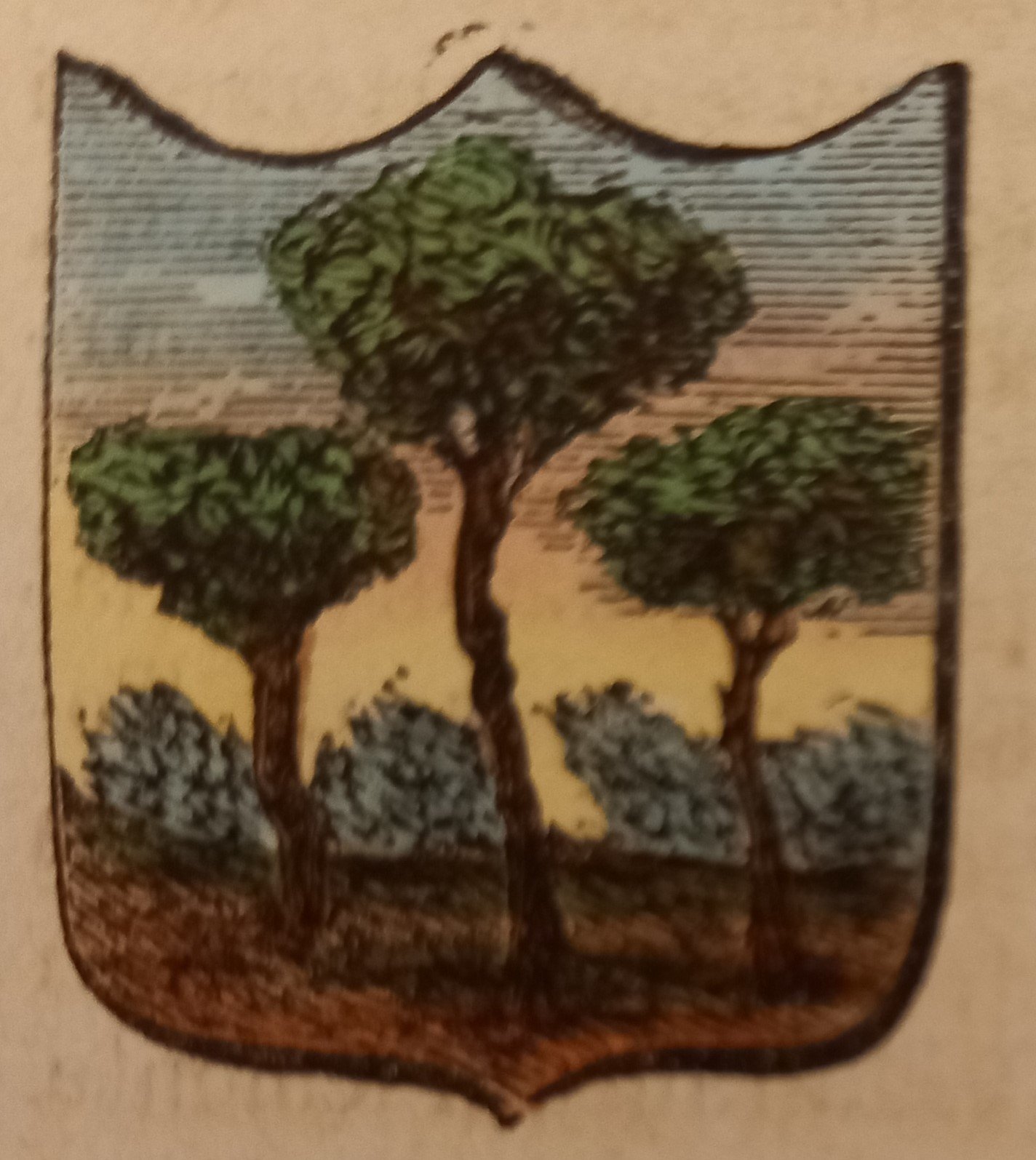 Piccolo stemma comunale colorato a mano d’epoca (cm. 3,8 x 3,2 ca.). Stralcio dal Dizionario Corografico illustrato dell’Italia, edito a Milano nel 1868. Ogni stemma di questa raccolta è inserito in una o più pagine di testo con la descrizione della località, notizie storico - geografiche e statistiche (numero degli abitanti e degli elettori, guarnigioni della Guardia Nazionale, ecc.). Spesso il testo è redatto da studiosi locali o dai sindaci, con maggiori, interessanti notizie.