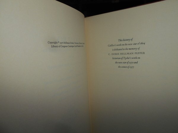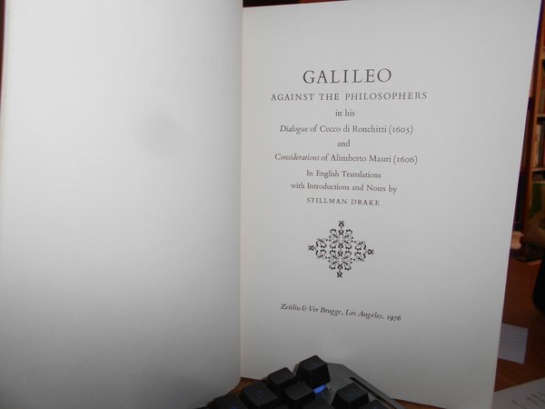 STILLMAN DRAKE. Los Angeles, Zeitlin & Ver Brugge, 1976. GALILEO against the philosophers in his Dialogue of Cecco di Ronchitti (1605) and Considerations of Alimberto Mauri (1606). In English Translations with Introductions and Notes by STILLMAN DRAKE. In-8°, tela. xviii, 151, (7) pp. con alcune illustrazioni. Come nuovo parzialmente intonso. Uff. C - II - 1
