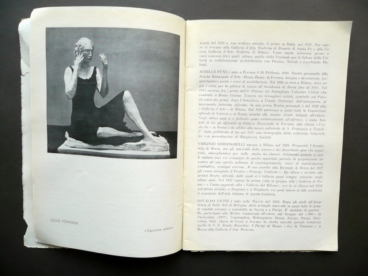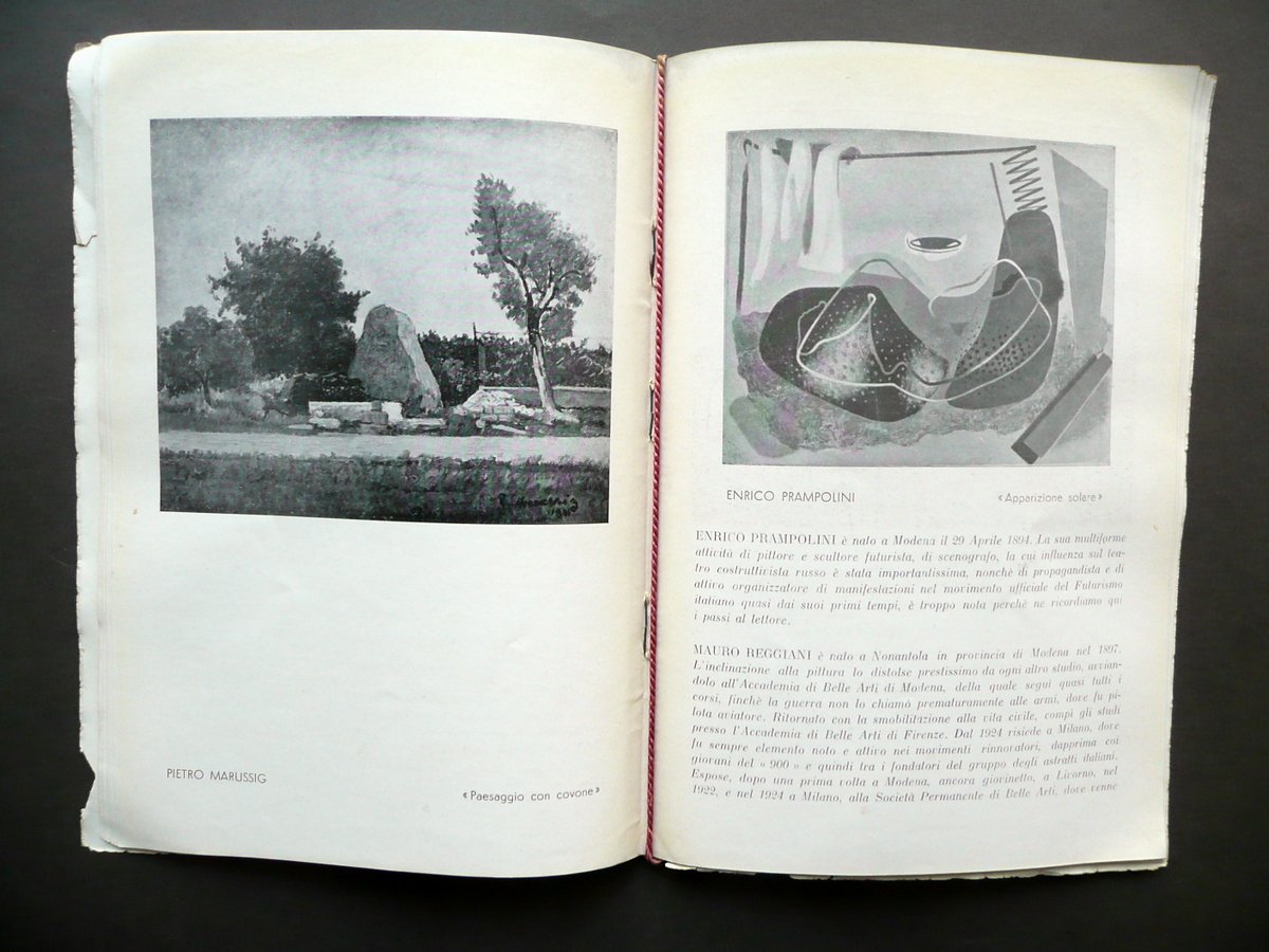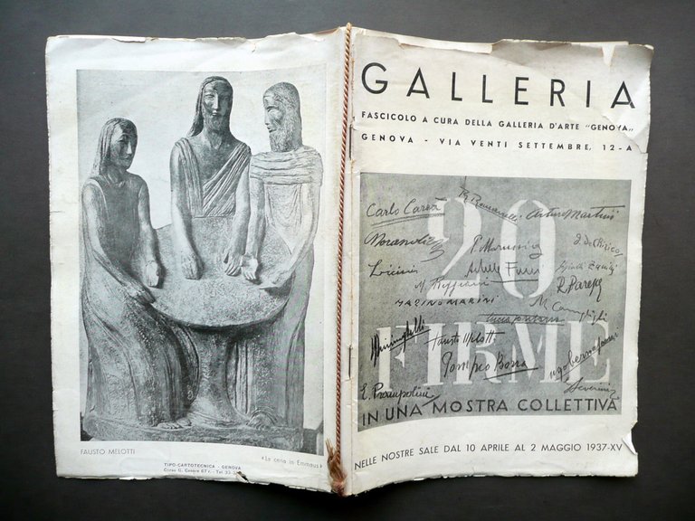 Fascicolo - catalogo, Galleria" Fascicolo a cura della galleria d'arte "Genova" Genova - Via XX Settembre 12-A - 20 Firme In una mostra collettiva Nelle nostre sale dal 10 aprile al 2 maggio 1937 Genova 1937; cm 25x17; pp. non num. (pp. 44), con numerose ill. in b/n nel t. e fuori t.; legatura ed. con cordella e spillature. Fascicolo - catalogo completo. Condizioni di conservazione Esemplare in condizioni più che discrete con tracce d'uso, qualche minuscola brunitura e pressoché trascurabili accenni di sporco; margini e angoli della prima e dell'ultima pagina con alcuni strappetti generalmente di piccole dimensioni e poche minime / circoscritte mancanze. Interni buoni. Raro interessante fascicolo - catalogo di mostra collettiva che vide la partecipazione di alcuni dei più importanti artisti italiani del Novecento (Lucio Fontana, Prampolini, Morandi, Severini, Carrà, Licini, De Chirico, Reggiani, ecc.) OPEB.3379 N "