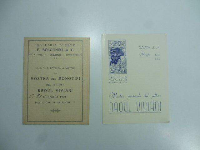 Pieghevole di 4 facciate (ciascuna misura cm 11 x 15), invito alla mostra delle opere di Raoul Viviani alla Galleria Bolognesi di Milano. All'interno breve testo di presentazione dal titolo 'I monotipi di Raoul Viviani' ed elenco delle opere esposte. Si allega secondo pieghevole di 4 facciate relativo alla mostra dello stesso artista alla Galleria Alessandro Gazzo di Bergamo, del maggio 1941, con breve profilo biografico ed elenco delle opere.