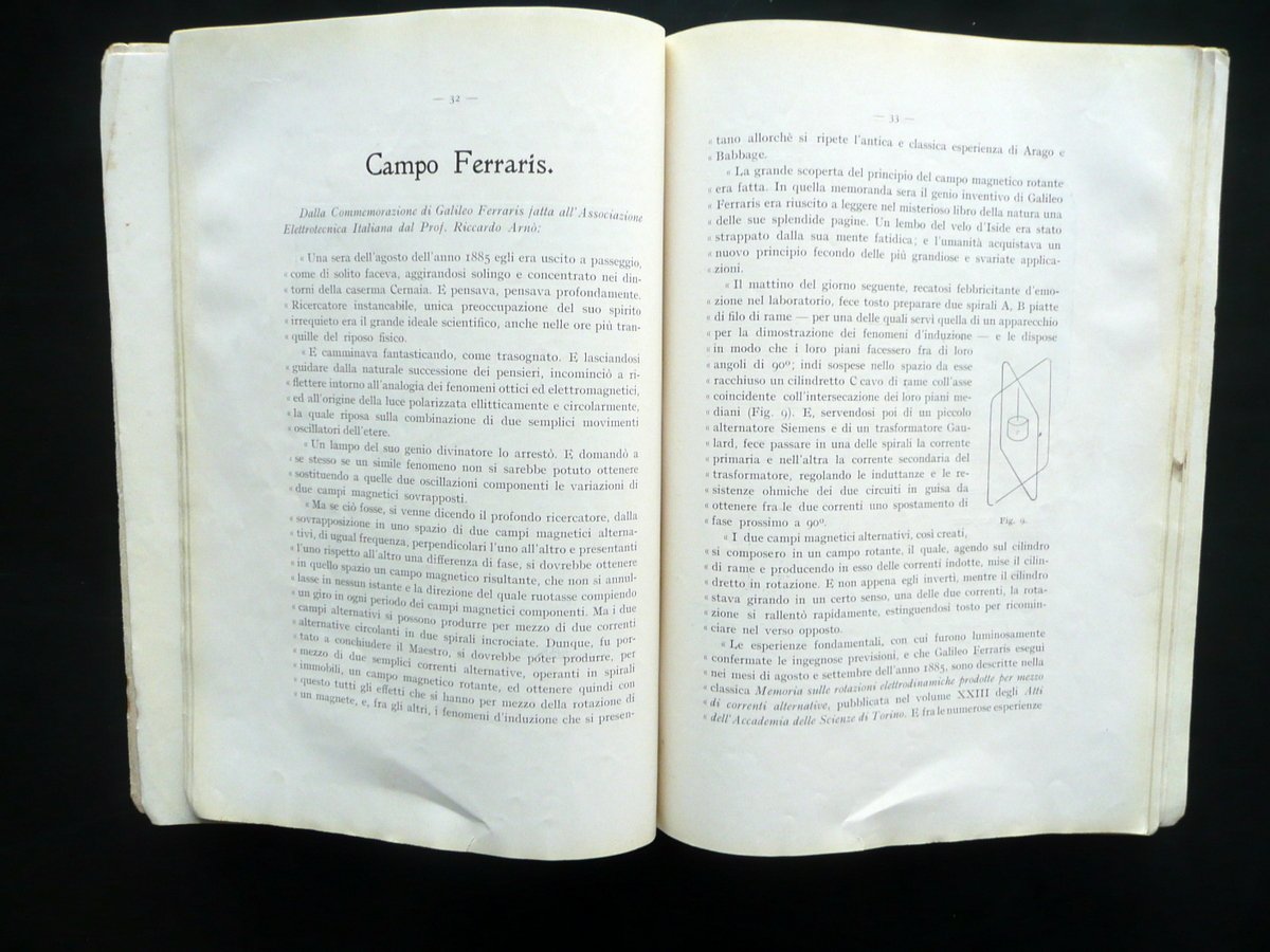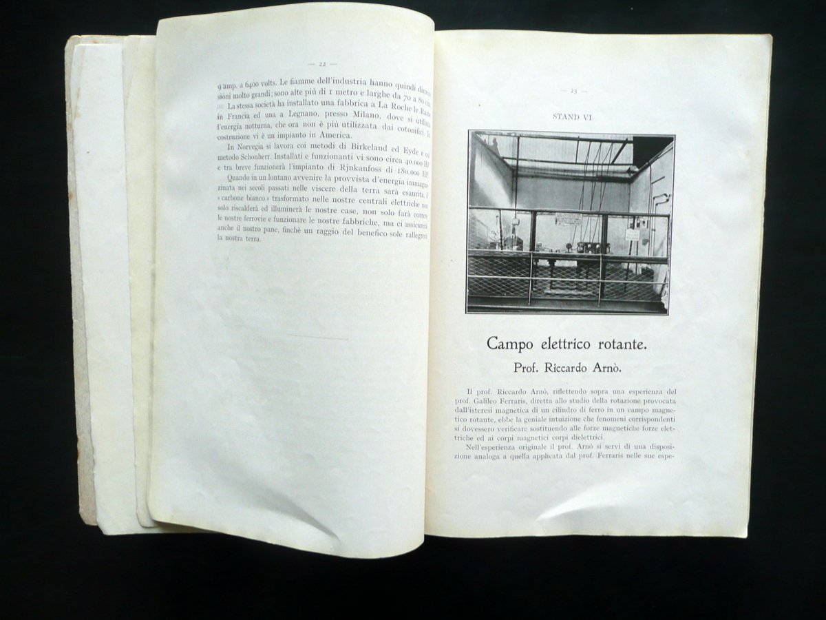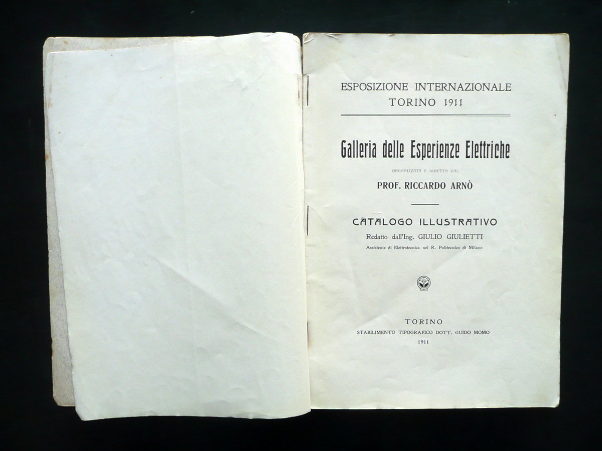 Catalogo, Esposizione Universale Torino 1911 - Galleria delle Esperienze Elettriche organizzata e diretta dal Prof. Riccardo Arnò Catalogo illustrativo redatto dall'Ing. Giulio Giulietti Assistente di Elettrotecnica nel R. Politecnico di Milano - Con dedica autografa firmata di Riccardo Arnò alla brossura anteriore (vedi foto) Stabilimento Tipografico Dott. Guido Momo, Torino 1911; cm 24x16,5; pp. 66 con 26 fig. in b/n nel t. e fuori t.; brossura ed. Margine sup. della brossura ant. con dedica autografa firmata dell'Arnò, in condizioni come da foto e da descrizione. Condizioni di conservazione Esemplare complessivamente in buono stato con tracce d'uso e leggeri segni del tempo, qualche piccola lieve brunitura, angoli con minimi accenni di pieghette, margine est. della brossura post. e di alcune pagine con una lieve decrescente ombra di gora che non interessa il testo o le illustrazioni; brossura ant. con qualche annotazione a penna e a pastello blu; dedica autografa oggetto di parziale cancellatura, dalla lettura non intuitiva (vedi foto). Dorso con qualche strappetto. Interni buoni; pp. 48-49 con qualche piccola abrasione da distacco dovuta a vecchia umidità; pagina 50 con un segnetto a pastello rosso al margine esterno. Interessante e non comune catalogo della sopraddetta galleria, allestita in occasione dell'Esposizione Universale di Torino del 1911. Tra le fotografie in bianco e nero dei vari stand vi figurano quello di Marconi (stand XII), di Ferraris (stand VIII), dello stesso Arnò (stand VI). Al margine superiore della brossura anteriore è presente una dedica autografa firmata di Riccardo Arnò, purtroppo oggetto di cancellatura e di non intuitiva lettura (vedi foto). OPEB.3930 N