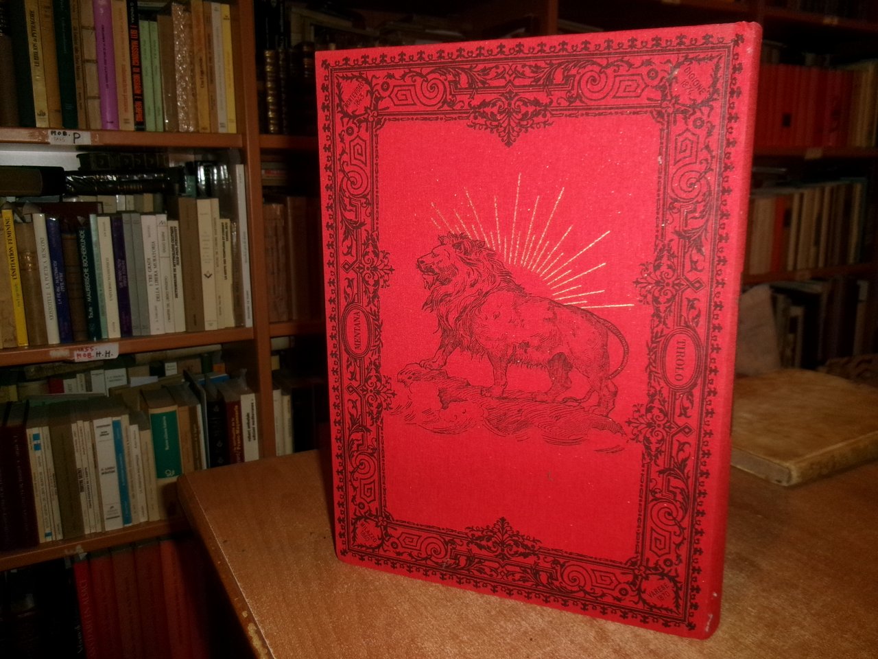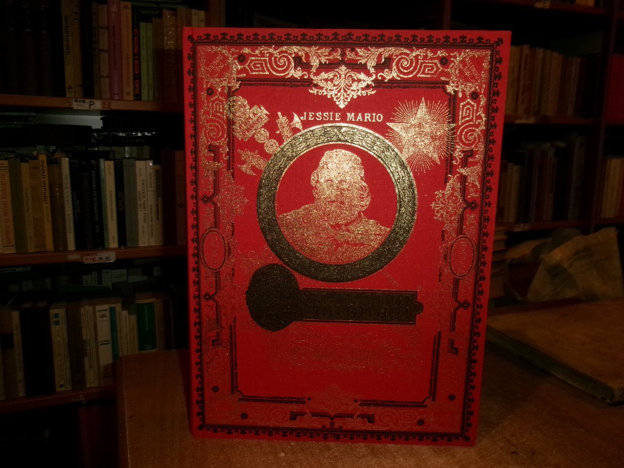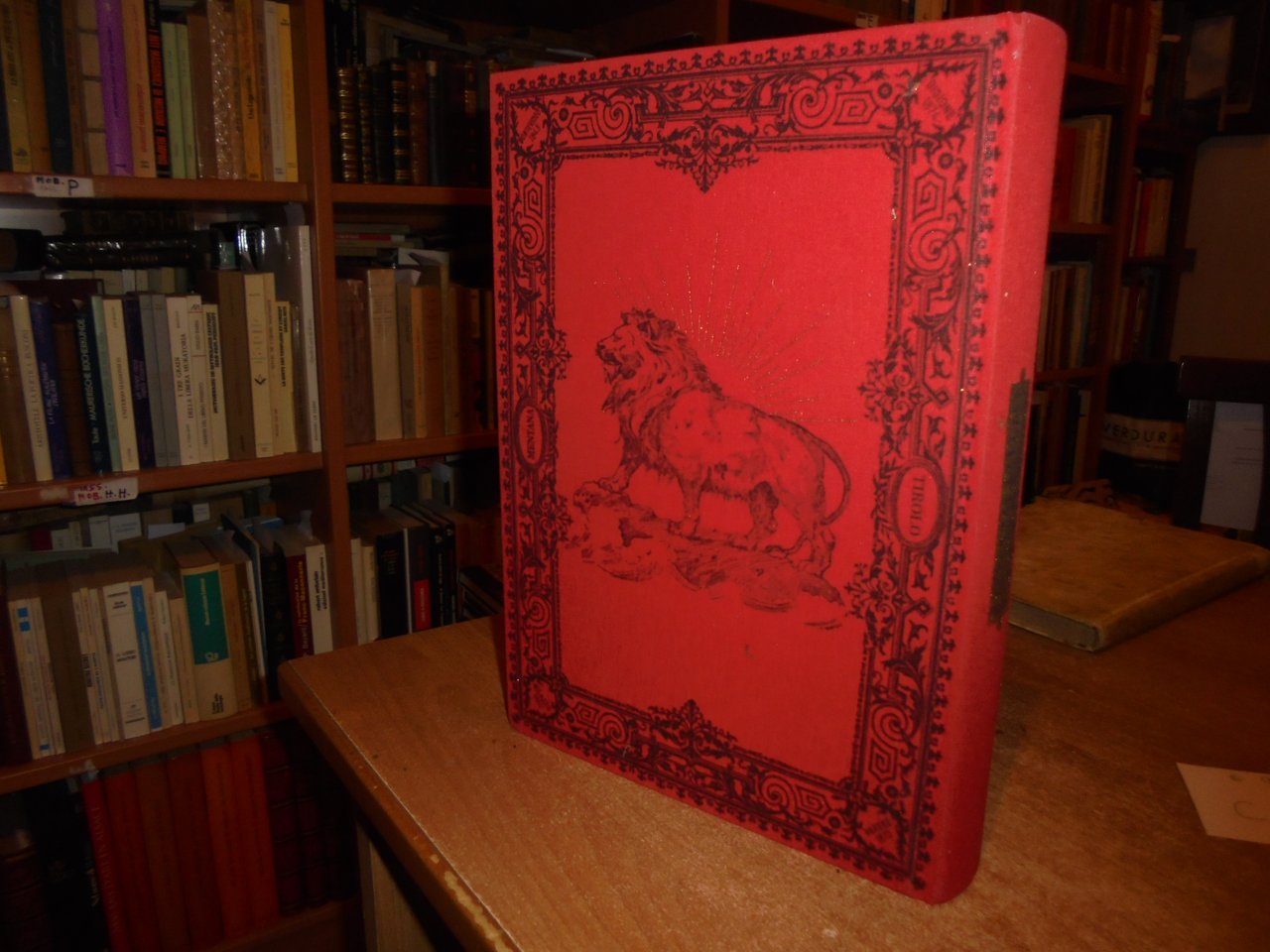 Legatura editoriale di lusso in piena tela percallina rossa riccamente decorata, in oro al piatto anteriore ritratto di Garibaldi impresso in oro, al piatto posteriore profilo di leone sotto raggi di sole.