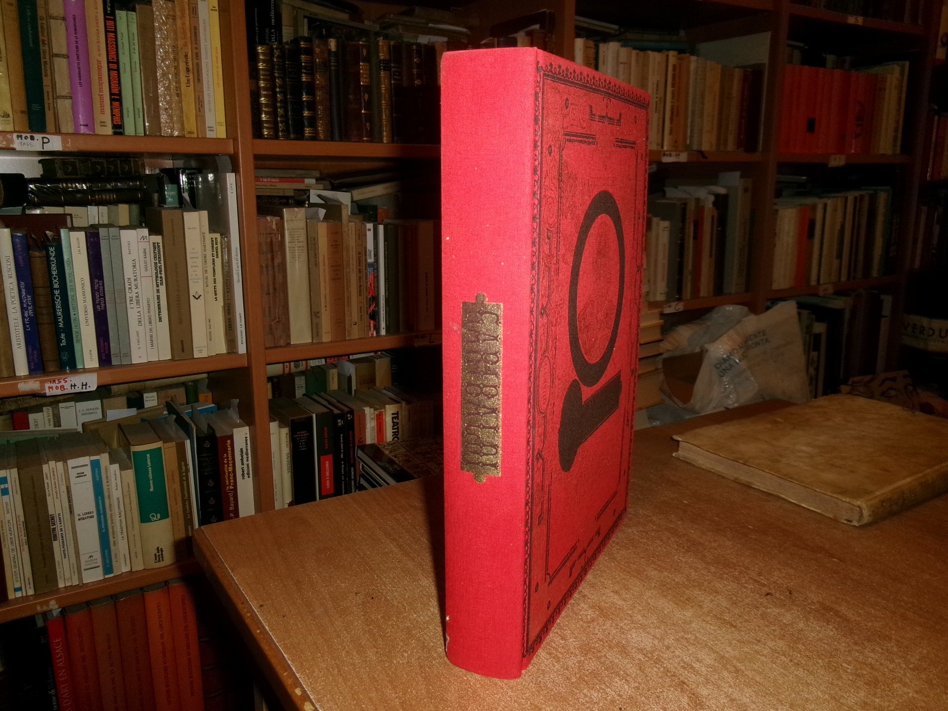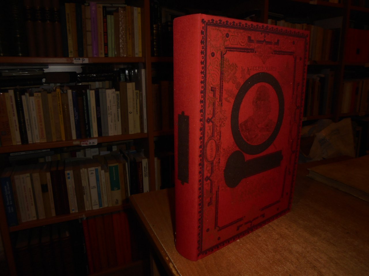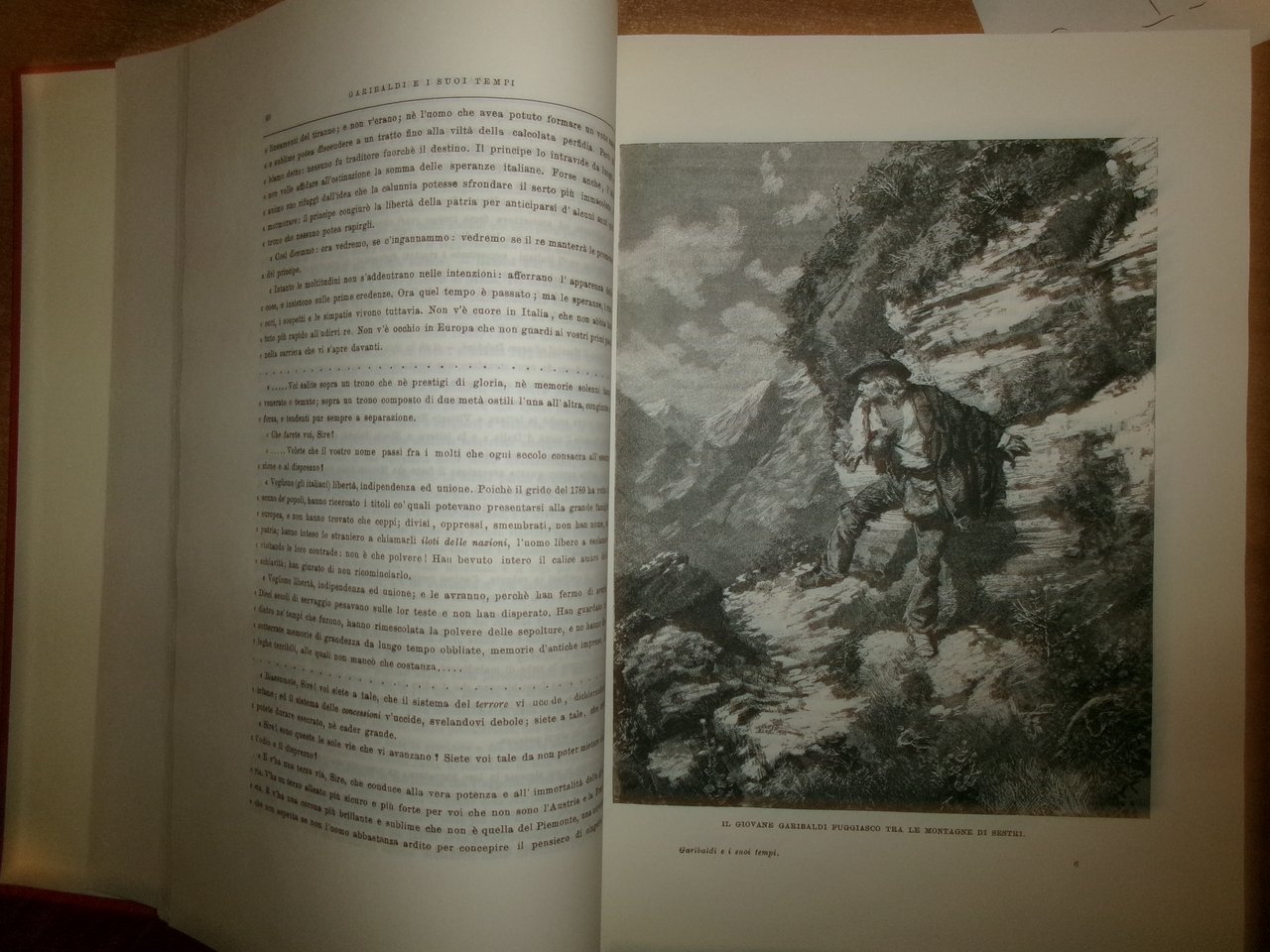 Legatura editoriale di lusso in piena tela percallina rossa riccamente decorata, in oro al piatto anteriore ritratto di Garibaldi impresso in oro, al piatto posteriore profilo di leone sotto raggi di sole.