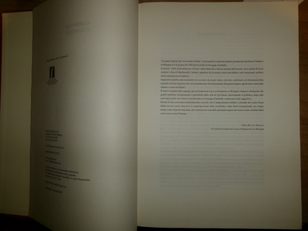 JESSIE W. MARIO. Bologna, Bononia University Press, 2007. GARIBALDI e i suoi tempi. In-folio, 3 cc. non num. inclusi l’occhietto e il frontespizio, 843pagg. num., 1 pag. non num. (bianca).