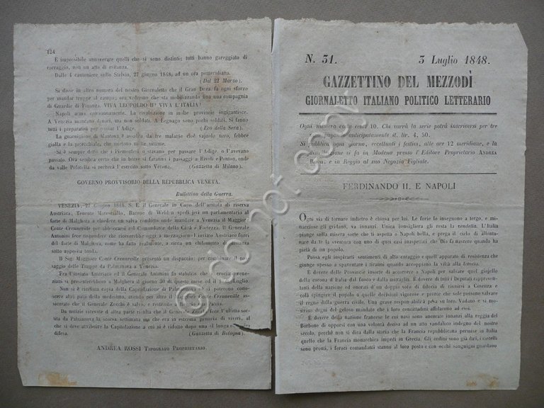 Gazzettino del MezzodÏ N.31 3 Luglio 1848 Ferdinando II Risorgimento Guerra | Libri antichi e moderni |