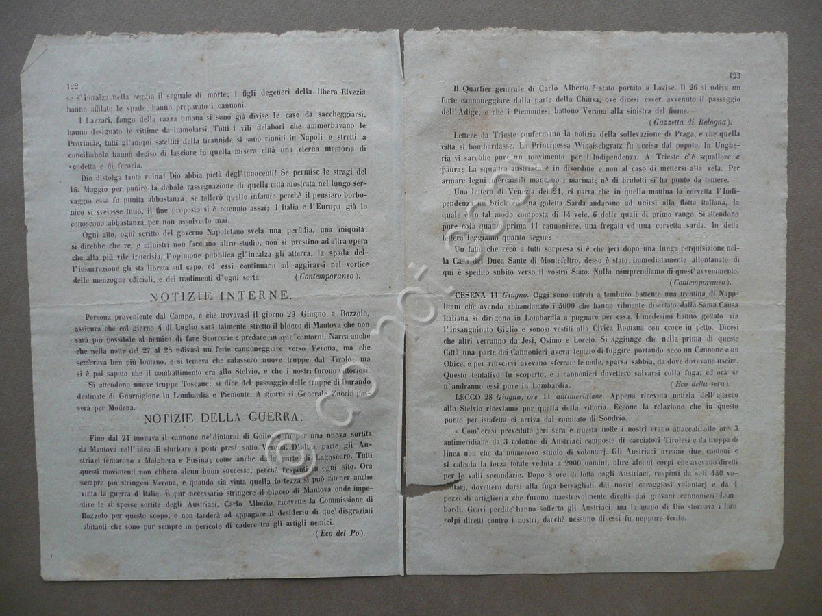Giornale, Gazzettino del Mezzodì giornaletto italiano politico letterario N. 31 3 Luglio 1848 Andrea Rossi Tipografo Proprietario, Modena 1848, cm 23,5x16, pp. 4 (bifolio). Numero completo. Condizioni di conservazione Esemplare complessivamente in buone condizioni con tracce d'uso, leggere pieghe di conservazione, piccole lievi bruniture, quarta pagina con piccola mancanza a un margine che interessa qualche carattere ma che non compromette la lettura del testo, dorso con strappo di vari cm e leggere tracce di precedente inserimento entro volume. Interessante giornale risorgimentale modenese, con notizie da tutta Italia sulla Prima Guerra d'Indipendenza (vedi foto). In questo numero, tra le varie località, sono presenti alcune notizie sull'andamento del conflitto a Goito e a Lazise. Esemplare rarissimo.