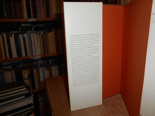 Buonarroti, Michelangelo. Berlin, Verlag, 2000. Gedichte Michelangelos. [Italienisch-Deutsch]. Übers. von Thomas Flasch. Mit einem Nachw. von Gustav Seibt. In-8°, tela edit. rossa con titolo al dorso, sovracopertina. 151 pp. con alcune illustrazioni n.t. Ottimo stato. Uff. stanzetta mob. sinistra II - 3 carc.