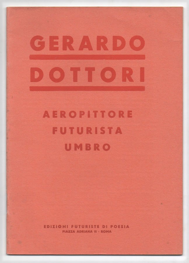 LIBROEdizione originale.Ottimo esemplare.«[.] prima monografia dell’artista perugino con al suo interno testi di Marinetti, Franca Corneli [sull’operato come direttore dell’Accademia di Belle arti di Perugia], Albano [tolto da «Bisogna creare»], un’antologia di scritti critici e il testo “La mia pittura futurista umbra”, meglio noto come “Manifesto umbro dell’aeropittura”» (Duranti, Dottori catalogo generale, p. 905a, che data al 1941). L’articolo più tardo citato nella rassegna stampa risale all’8 novembre 1941, già dunque nel ventesimo dell’era fascista, da cui l’incertezza sulla datazione: a fine del 1941 o inizio del 1942.Cammarota, Futurismo, Libri di aa. vv., 85; Id., Marinetti, Prefazioni, 208