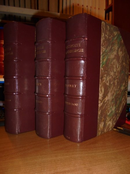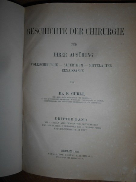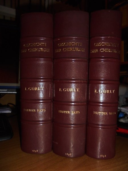Dr. E. GURLT. Berlin, Verlag Von August Hirschwald, 1898. GESCHICHTE DER CHIRURGIE Und Ihrer Ausübung Volkschirurgie-Alterthum-Mittelalter Renaissance. 3 volumi in-8°, m. marocchino con larghe punte, dorsi a 5 nervi con titoli in oro. Vol. I. ix, (1), 834 pp., con numerose illustrazioni tavole fuori testo ripiegate. Vol. II. vii, 926 pp. con numerose illustrazioni tavole fuori testo ripiegate. Vol. III. xvi, 976 pp. con numerose illustrazioni tavole fuori testo ripiegate e nel testo. Prima edizione della storia ineguagliabile e indispensabile della chirurgia classica di Ernst Julius Gurlt (1825-1899). Una storia di chirurgia fino alla fine del XVI secolo. Include traduzioni dalla letteratura e numerose illustrazioni di strumenti. Perfetto esemplare in edizione originale con legatura di pregio. Uff. D - III - 2