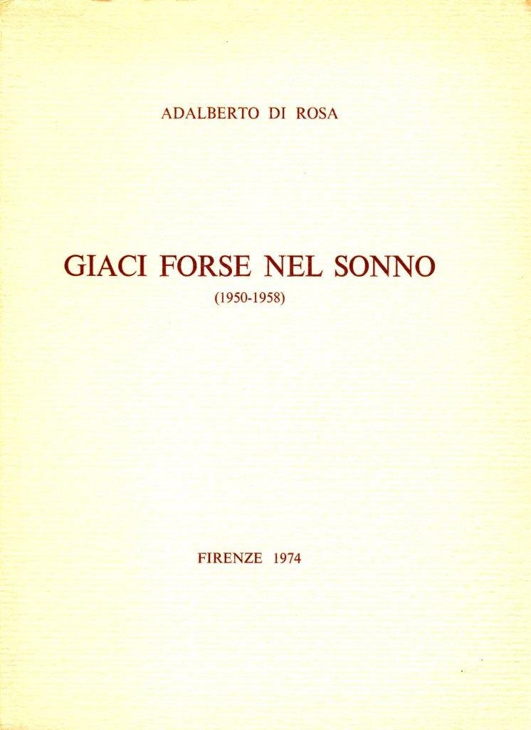 Giaci forse nel sonno (1950-1958), prima edizione luglio 1974, pp. 61, formato 16,5 x 22,5.<BR>Copertina morbida di color crema con titoli in marrone al piatto anteriore. Tiratura limitata in 100 esemplari numerati, nostra copia n. 54. All'interno presente firma dell'autore. <BR>Ottime condizioni.