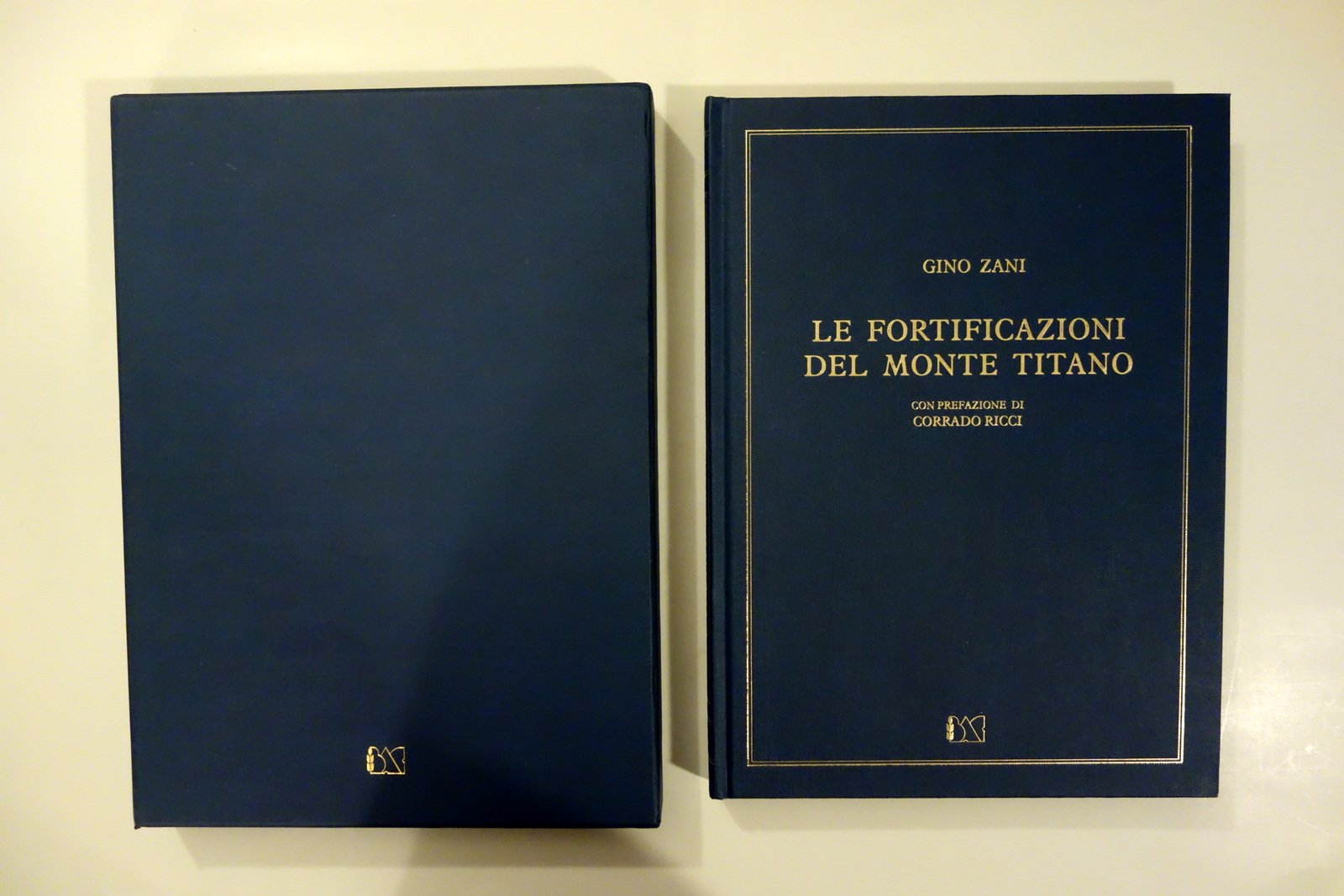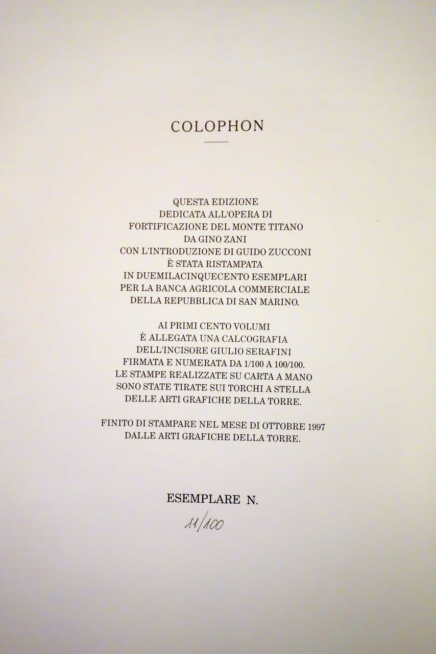 Gino Zani, Le fortificazioni del Monte Titano con prefazione di Corrado Ricci Banca Agricola Commerciale, San Marino 1997; cm 33,5x24,5; pp. XVI-184 con varie ill. in b/n nel t. e alcune tavv. applicate su cartoncino fuori t., tutte protette da velina. Elegante legatura in tutta tela ed. con titolo al dorso. Volume corredato della custodia ed. in cartonato telato. Condizioni di conservazione Ottime condizioni, poco sfogliato; solamente lato posteriore della custodia con un leggerissimo alone. Volume e interni ottimi, freschi. Pregevole ristampa a cura della Banca Agricola Commerciale di San Marino, in 2500 esemplari. Volume appartenente alla serie dei primi 100 volumi (n/s 11 di 100), purtroppo mancante della calcografia del Serafini (vedi foto colophon). SETT102.L25170 N