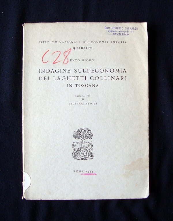 Giorgi Enzo, Indagine sull'Economia dei laghetti Collinari in Toscana introduzione di Giuseppe Medici Staderini, Roma, 1959; cm. 24,5x17; pp. 131; br. ed. con tabelle e ill in b/n; foglio sciolto con appunti(vedi foto); timbro di proprietà al margine sup. br.ant. Condizioni di conservazione Esemplare in buono stato con leggere tracce d'uso e del tempo; br con qualche macchietta e leggere bruniture ai margini e segni di matita rossa (vedi foto); cuffie del dorso con piccoli strappetti e traccia di peccetta; interni con qualche sottolineatura a penna (vedi foto) ma complessivamente buoni. OPEB.4812 blu