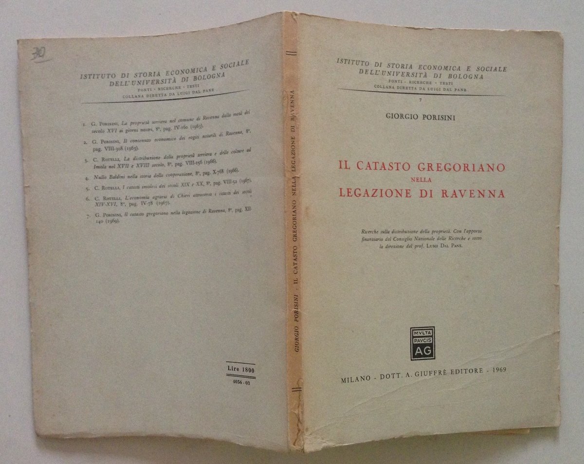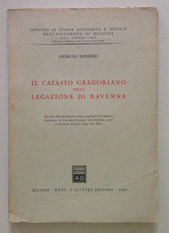 Giorgio Porisini, Il catasto gregoriano nella legazione di Ravenna Giuffrè Editore, Milano 1969; cm 25x18; pp. 140; br. ed. Condizioni di conservazione Esemplare ben conservato con leggere tracce d'uso e del tempo e con minime bruniture; brossura editoriale anteriore con una piega all'angolo inferiore (vedi foto). SETT135.L13628 MT