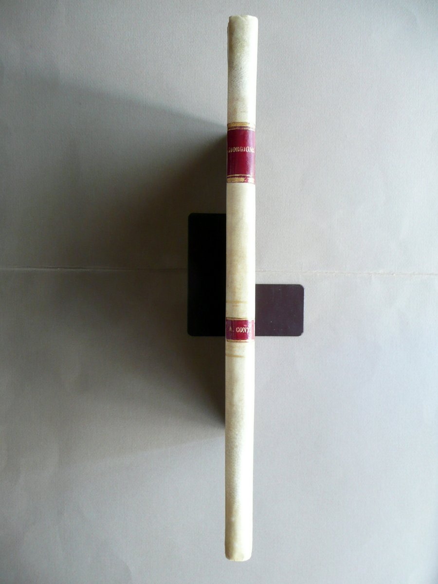 Angelo Conti, Giorgione Studio di Angelo Conti Fratelli Alinari, Firenze 1894, cm 34x26, pp. 84 con varie ill. in b/n nel t. e con qualche bella tavola in b/n fuori t., tutte protette da velina (vedi foto); legatura novecentesca in mezza pergamena (dorso e angoli), con titolo in oro entro tassello al dorso. Condizioni di conservazione Esemplare ben conservato con tracce d'uso; coperta con qualche leggero alone e pressoché trascurabili accenni di sporco; margini dei piatti con qualche minima abrasione e strappetto. Interni buoni con alcune piccole leggere bruniture; angolo sup. delle pp. 57-66 con leggere tracce di pieghette. Rara edizione originale del 1894. SETT126.L12278 N