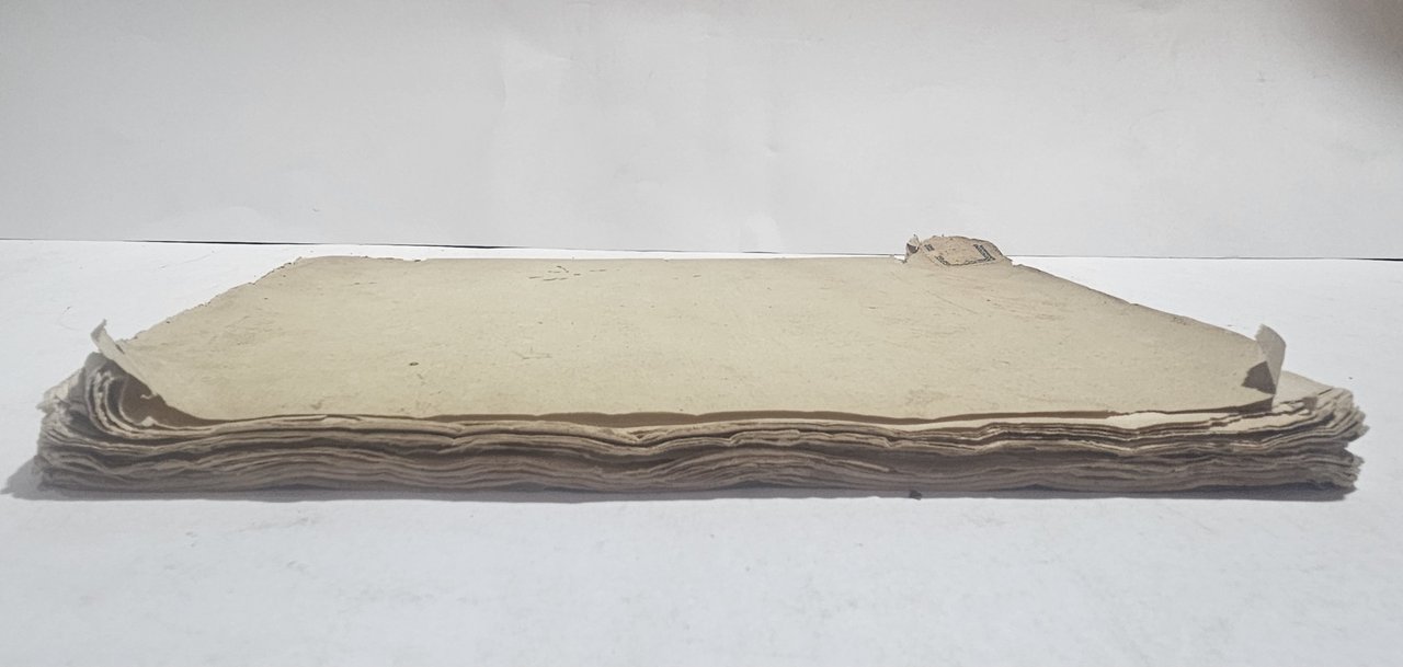 Piatti con tracce di polvere e annotazioni a matita rossa al piatto anteriore con tentativo di cancellazione
