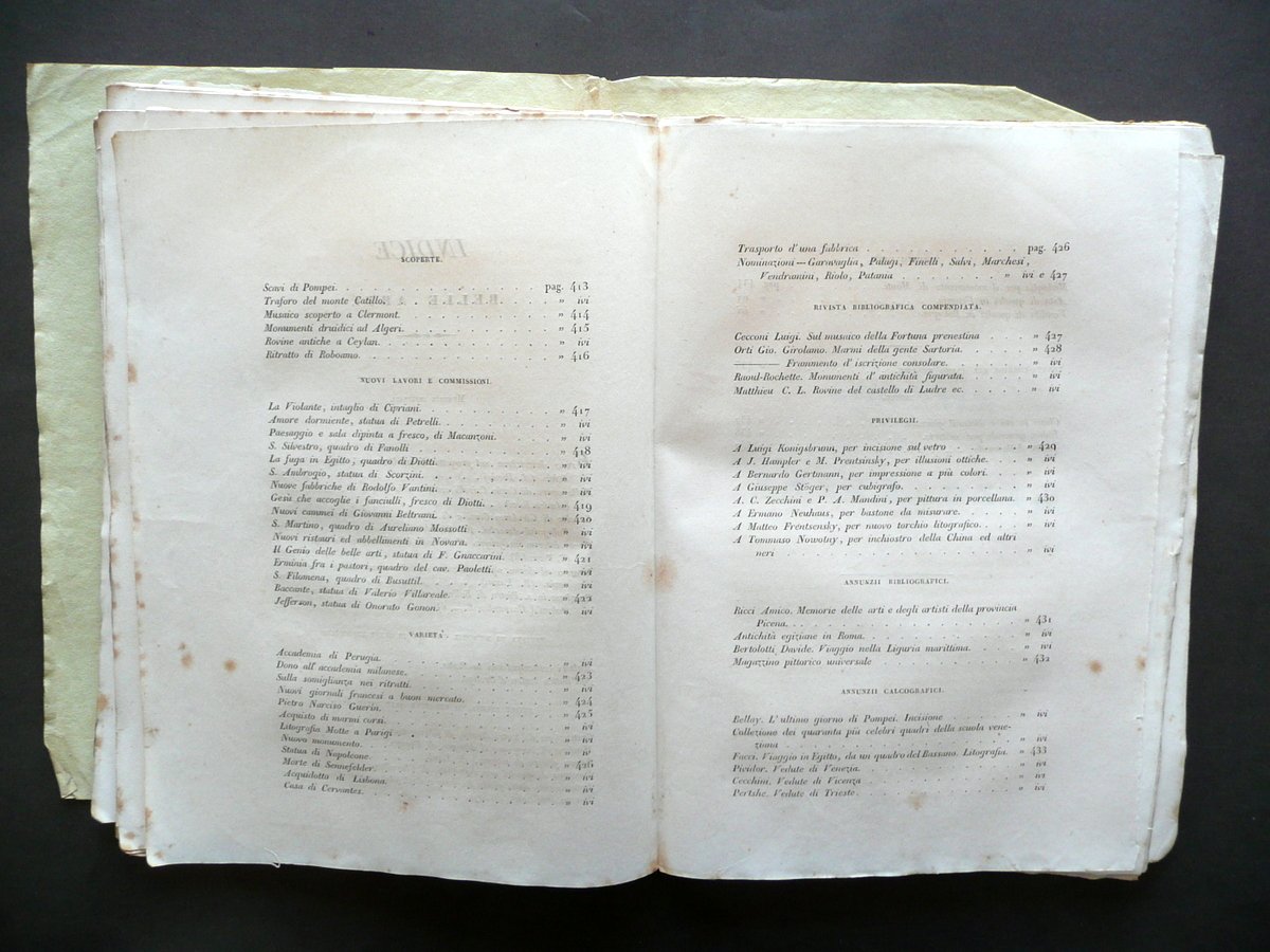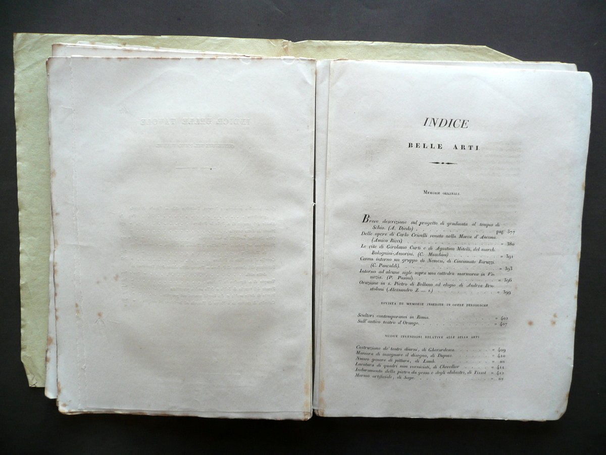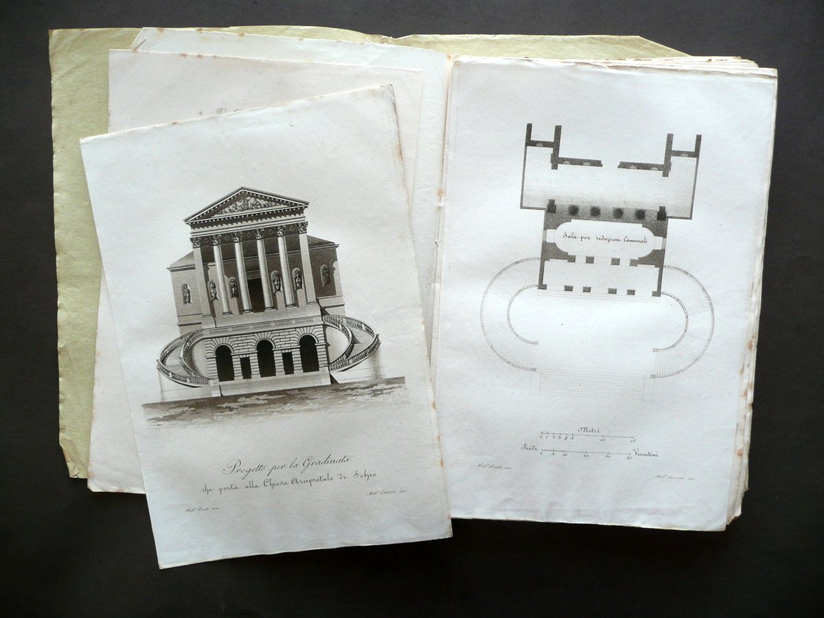 Breve descrizione sul progetto della gradinata che porta alla chiesa arcipretale di Schio" in "Giornale di Belle Arti e Tecnologia" (sezione "belle arti") Anno primo Numero 8 - dicembre 1833 Paolo Lampato Tip. Editore, Venezia 1833; cm 24,5x17,5; da pagina 377 a pagina 452 (sezione belle arti); da pagina 337 a pagina 396 (sezione tecnologia), con sei tavole incise in b/n fuori t. (due alla sezione belle arti, quattro alla sezione tecnologia); esemplare autonomo con numerazione progressiva. Brossura ed. d'attesa. Condizioni di conservazione Esemplare complessivamente ben conservato con alcune piccole leggere bruniture, brossure con qualche lieve alone e pressoché trascurabili accenni di sporco, pieghette a tre angoli; brossura post. leggermente ingiallita. Interni in buona parte ancora intonsi; corpo del testo staccato dalla brossura con conseguente allentamento delle cuciture e distacco delle tavole in b/n (vedi foto). Margini con barbe. Per un elenco degli argomenti trattati vedi foto indici. Alla pagina 447 della sezione "belle arti" e a pagina 394 della sezione "tecnologia" sono presenti due indici delle tavole contenute nel primo volume. Tali indici sono relativi al totale delle tavole contenute in più fascicoli, che rilegati insieme sarebbero andati a formare il volume completo; non c'è pertanto corrispondenza tra le tavole qui presenti e quelle segnalate nei due indici. SETT134.L13345 N "