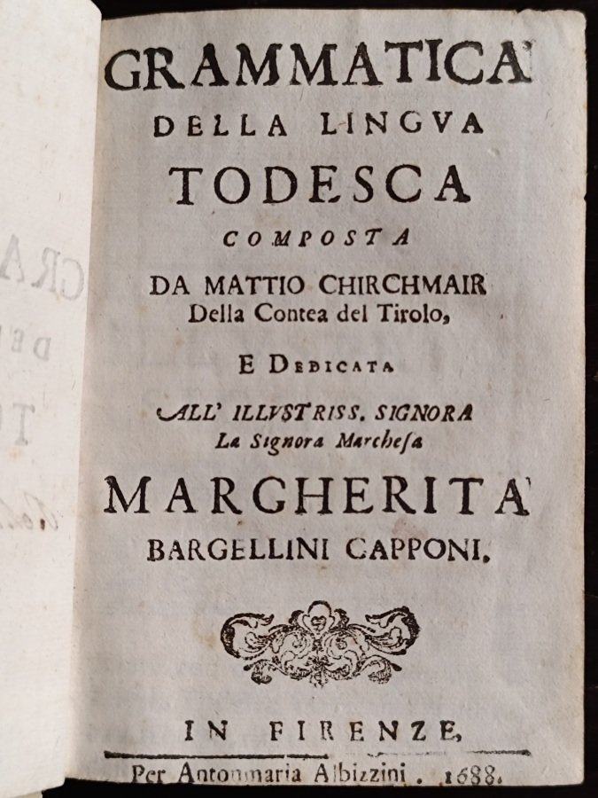 Grammatica della lingua todesca composta da Mattio Chirchmair della contea del Tirolo, e dedicata all'illustriss. signora la signora marchesa Margherita Bargellini Capponi. | Libri antichi e moderni | Chirchmair [Kirchmayer] Mathias.