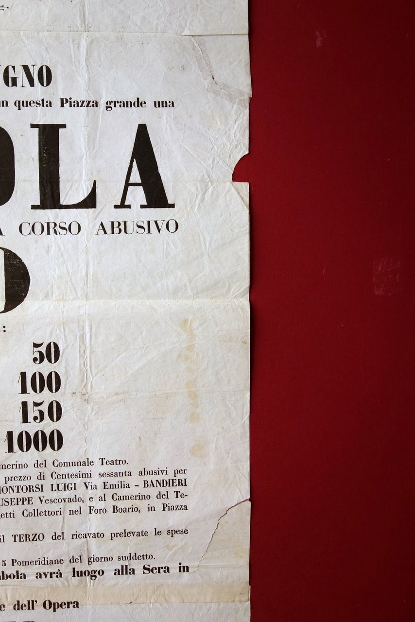 Grande avviso, Avviso città di Modena per superiore concessione nel giorno di lunedì 17 giugno prossimo venturo alle ore 5 pomeridiane verrà estratta in questa piazza grande una Tombola col premio di lire italiane a corso abusivo 1300 [.] Tipografia Cappelli, Modena 1845; grande avviso a stampa su carta; retro bianco. A causa delle grandi dimensioni, l'avviso è formato da due fogli applicati. Cm 75x46. Condizioni di conservazione Esemplare complessivamente in buono stato con tracce d'uso, pieghe di conservazione, piccole lievi tracce di sporco e stropicciature; margini lievemente rifilati, quello destro con due strappetti restaurati al retro mediante nastro per riparazioni cartacee, e con una piccola mancanza. EXTRA.0239 N