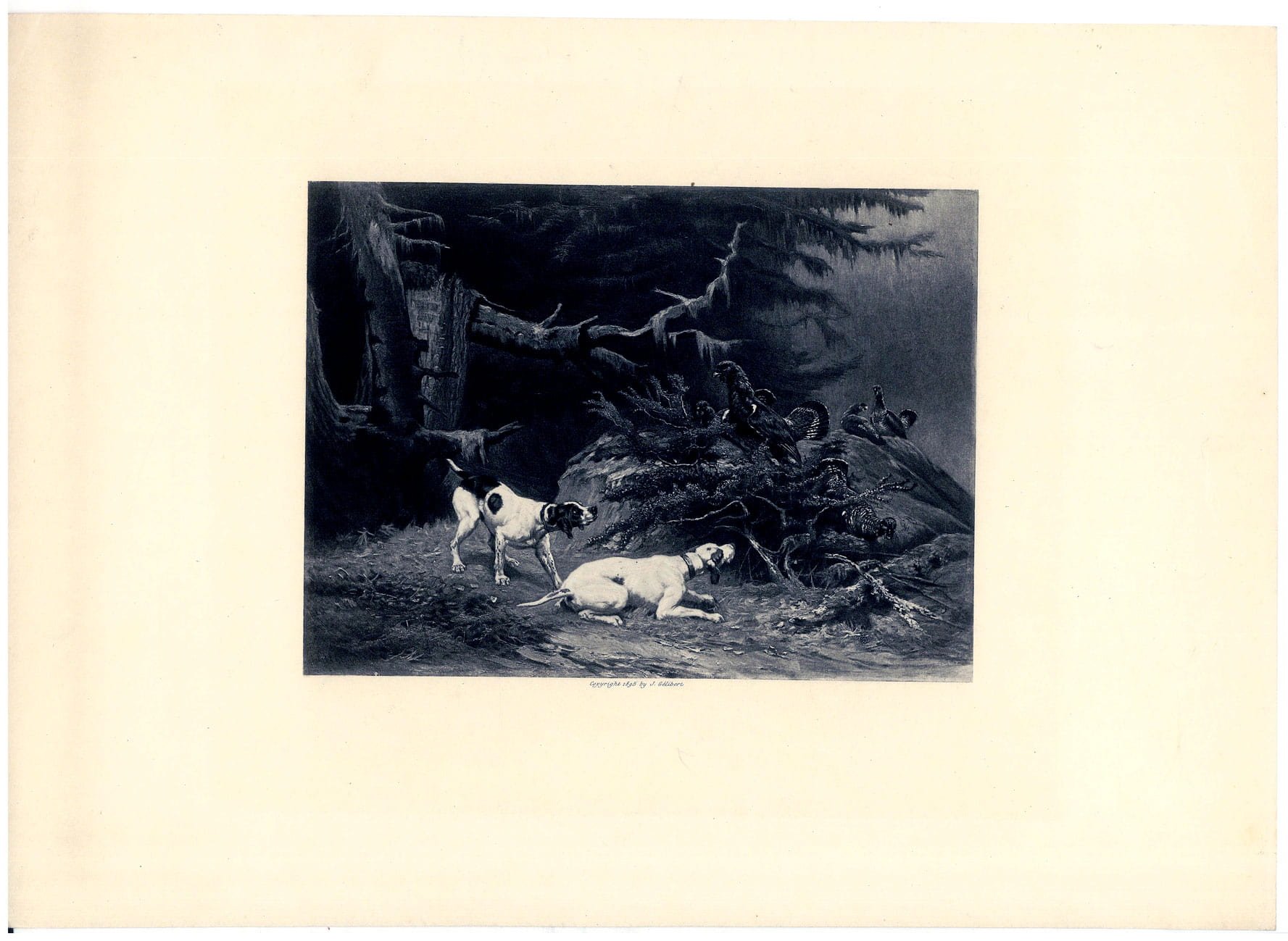 31,5X22,5 Cm. Scène de chasse dans la forèt. Chiens à l'arrêt devant plusieurs volailles. Gravure d'après une oeuvre de l'artiste peintre français Jules Gélibert (1834-1916), chasseur passionné, spécialiste des scènes animalières et fondateur du salon des peintres de chasse et de vénerie. Bon état.