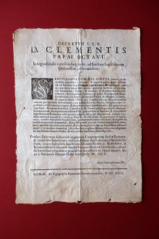 Grida, Decretum S. D. N. D. Clementis Papae Octavi In cognoscendis expediendisque causis, ad Sanctam Inquisitionem spectantibus, observandum [.] Ex Typographia Reverendae Camerae Apostolicae, Romae 1622; grande bel capolettera xilografico; margini alla forma. Testo in latino. Cm 38,5x28. Condizioni di conservazione Condizioni complessivamente buone con tracce d'uso e del tempo, pieghe di conservazione, ombre di gore di vecchia umidità che non comportano perdite di testo, qualche piccolo marginale difetto e strappetto. Per ulteriori dettagli vedi foto. Grida nella quale viene ribadito il decreto emesso da Papa Clemente VIII in merito ai compensi spettanti a tutti i religiosi e ufficiali aventi parte attiva nei processi inquisitoriali, i quali in nessun modo devono accettare compensi, donativi o altro di simile natura per i loro adempimenti e servizi. Molto interessante e rara. Originale. SETT199.L25704 N