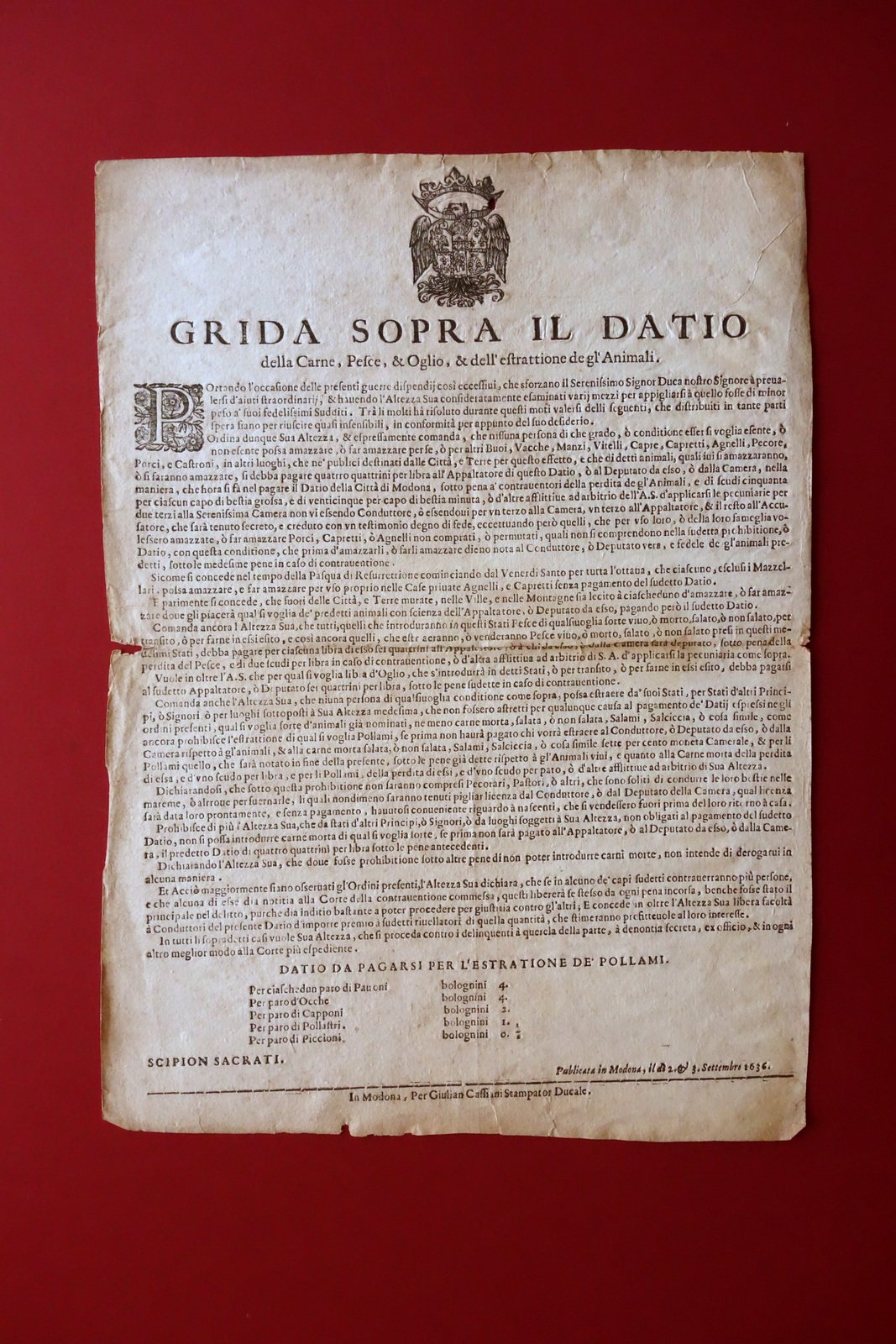 Grida Sopra il Dazio della Carne Pesce Olio Estrazione degli Animali Modena 1636