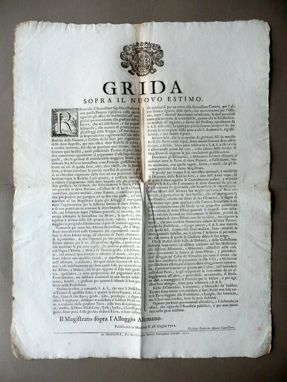 Grida, Grida Sopra il nuovo estimo Riflettendo il Serenissimo Sig. Duca Padrone con quella Paterna vigilanza colla quale riguarda gli affari de'suoi Sudditi all'inegualità poco conforme alla giustizia distributiva, che nel distribuire, e far pagare le imposte, che occorre di pratticare per gli Alloggi delle Truppe, e Contribuzioni Imperiali [.] Ha risoluto, che sollecitamente si faccia l'Estimo generale in detta Pianura, e Colline de'suoi stati tanto immediati, quanto mediati, [.] E di non pratticare in avvenire le dette Imposte sopra le Biolche, ma solamente sopra l'Estimo generale [.] Per Bartolomeo Soliani, Modena 1711, cm 50,5x39, foglio alla forma, testo su due colonne, bel capolettera e stemma incisi. Condizioni di conservazione Esemplare in buone condizioni con tracce d'uso, pieghe di conservazione, alcune minime lievi bruniture, margini est. entrambi con un pressoché trascurabile forellino. SC03.D12042 N "