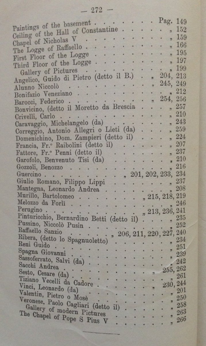 Hercules Massi , Description of the Galleries of Paintings in the Papal Palace of the Vatican Second Part Roma 1882; cm 19x12.5; pp. 272; Cappella Sistina, testo in lingua inglese, solo seconda parte; br. ed. - brossura posteriore mancante. Condizioni di conservazione Esemplare ben conservato con tracce d'uso e del tempo; brossura editoriale posteriore mancante (vedi foto); brossura anteriore con minime pieghette e mancanze agli angoli, con nome ex proprietario; dorso fessurato con minime mancanze alle cuffie, ma interni saldi. Testo in lingua inglese. SETT137.L11951 MT