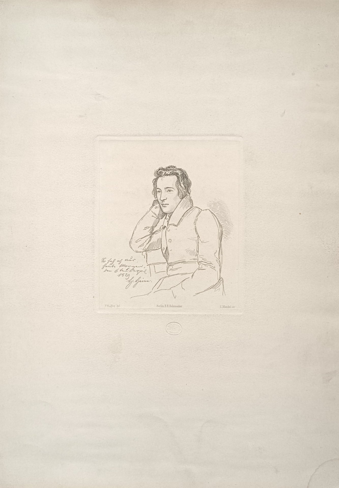 Da soggetto di F. Kugler. Heinrich Heine (1797 - 1856) fu un poeta, scrittore e critico letterario tedesco. acquaforte foglio cm. 31 x 45 - inciso cm. 13,5 x 16 Buono (Good) Buon es..