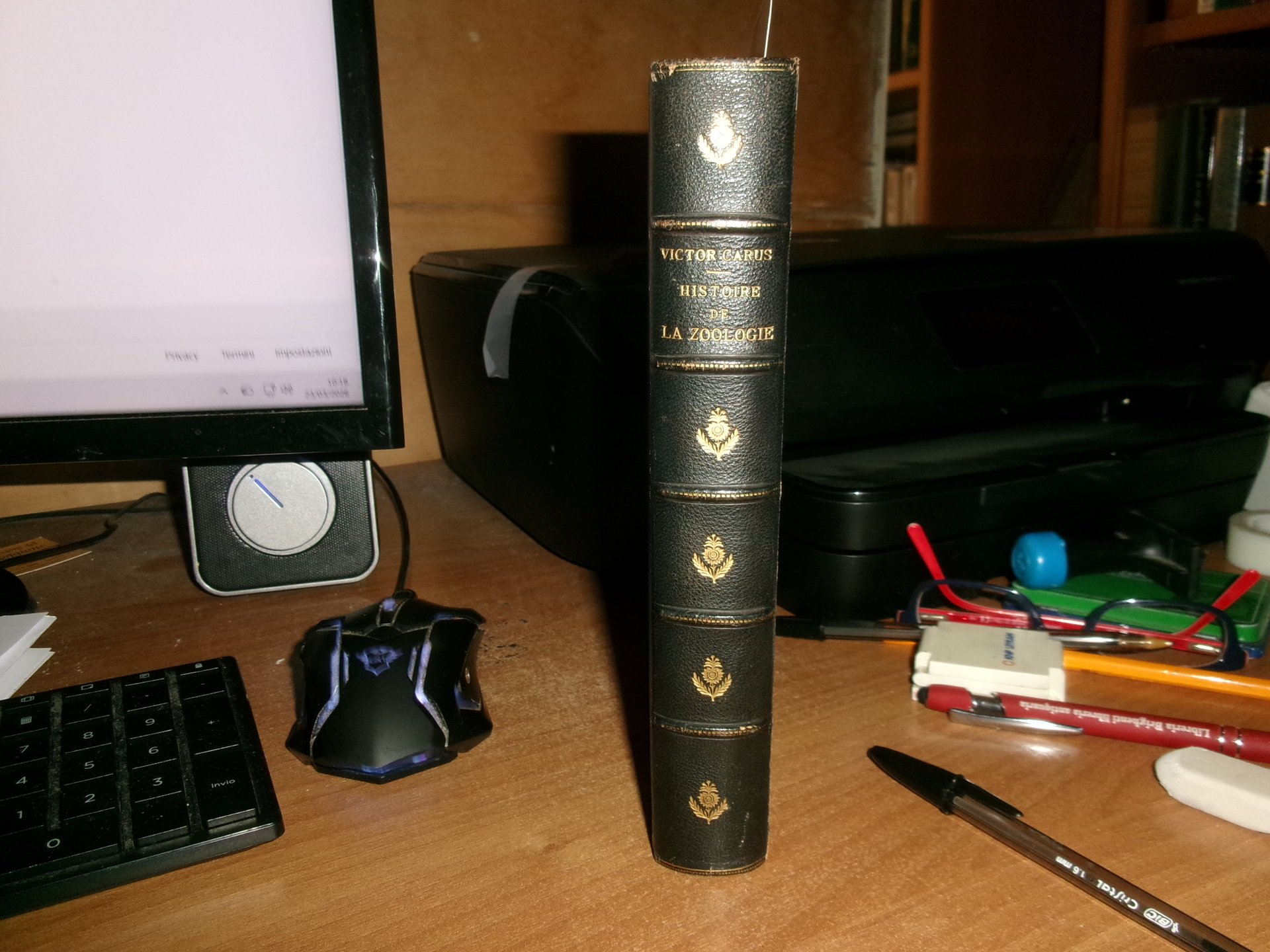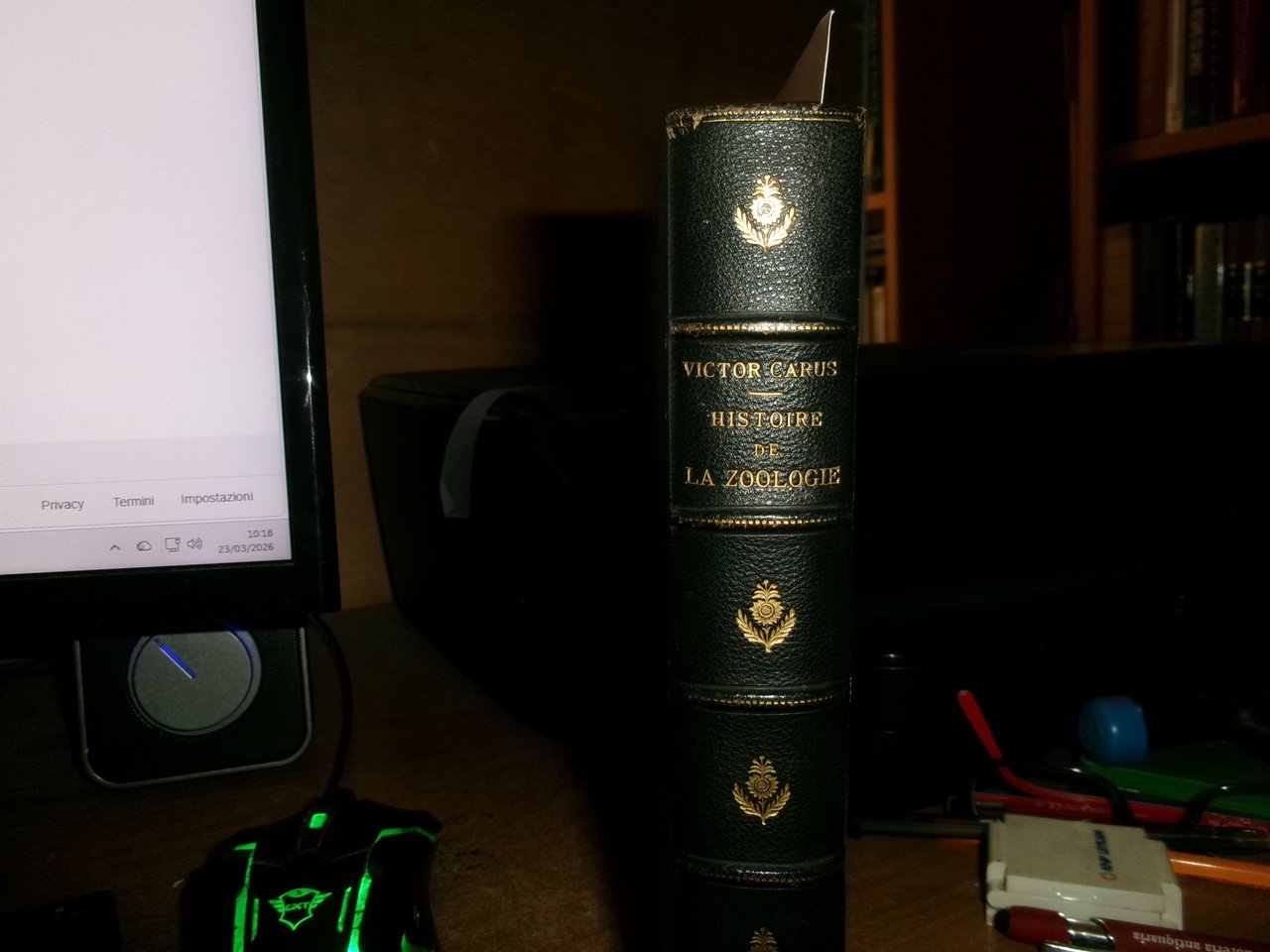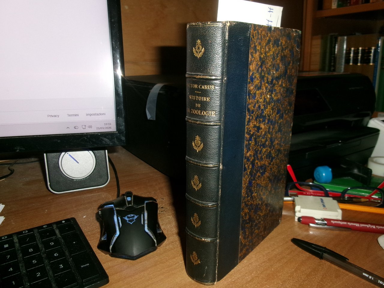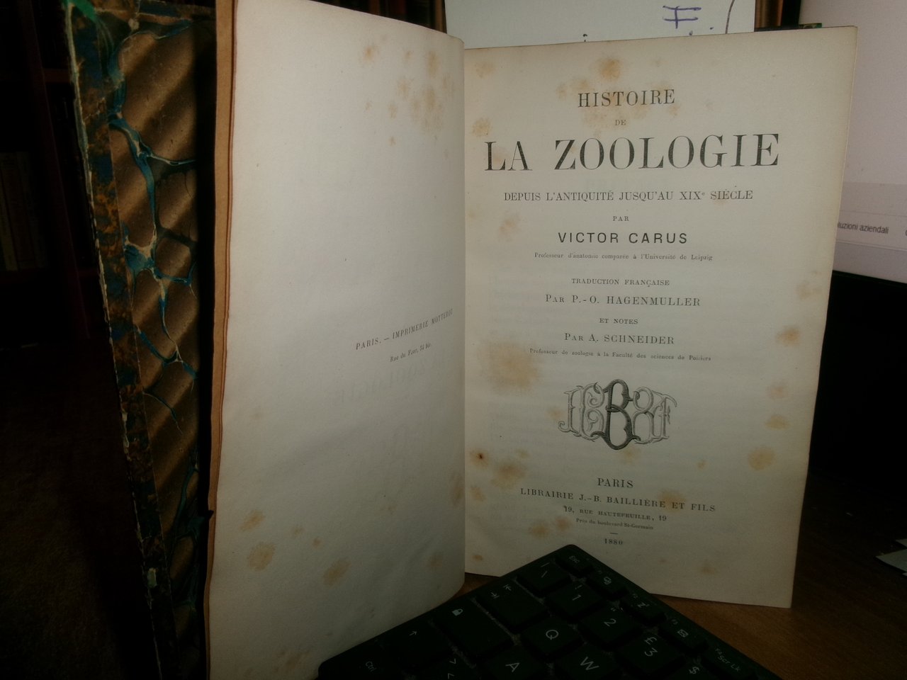 Victor, Carus. Paris, J.-B. Bailière, 1880. HISTOIRE de la Zoologie depuis l' antiquité jusqu'au XIX Siècle. In-8°, m. pelle coeva con dorso a nervi decorato in oro e segnalibro in cotone. viii, 623, (1) pp. Bell' esemplare con lievi fioriture in poche pagine con testo in francese. Neg. Mass. mob. H - H