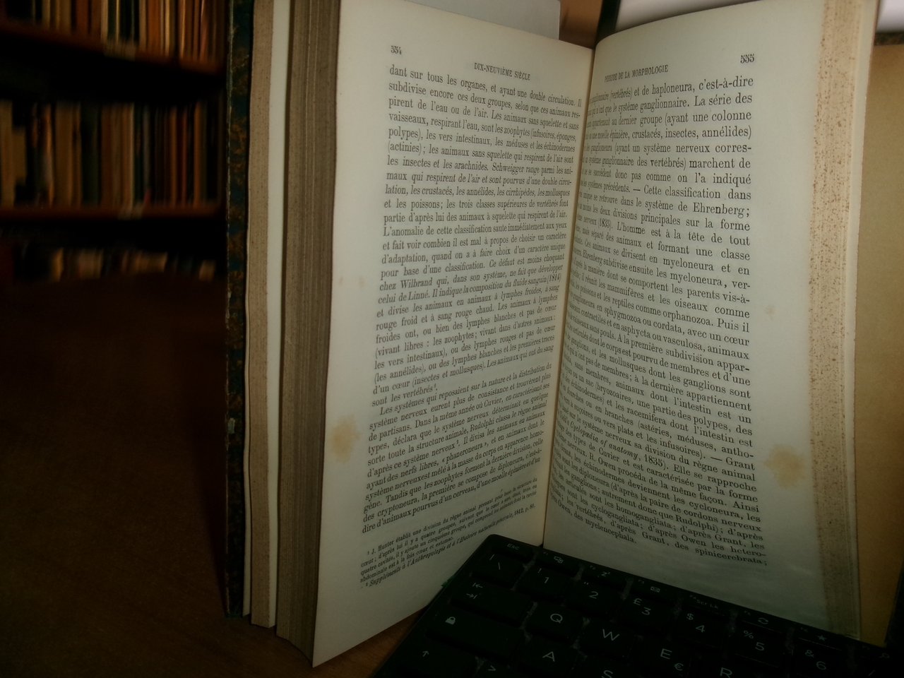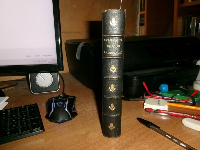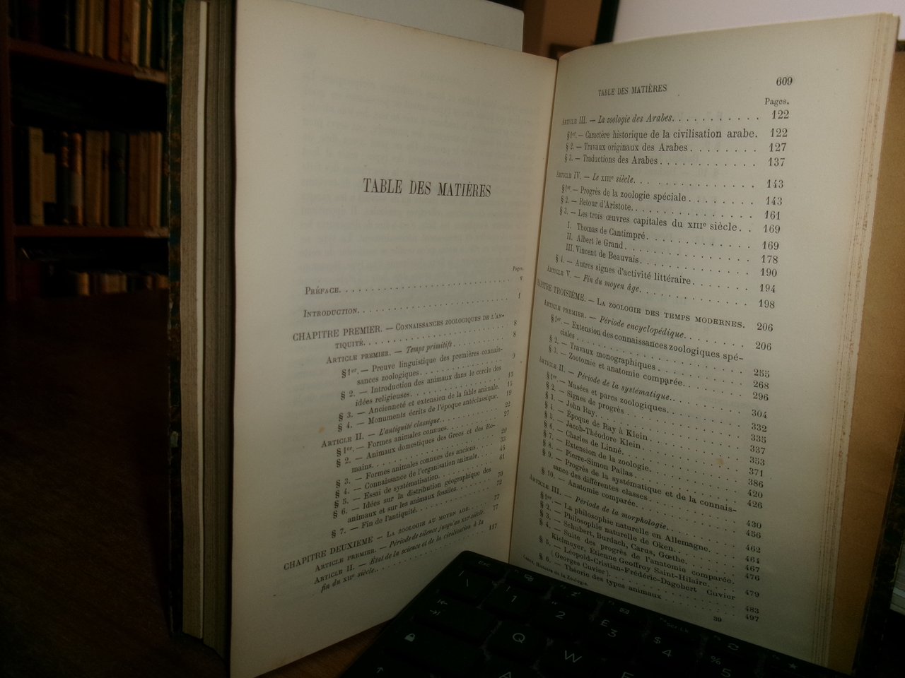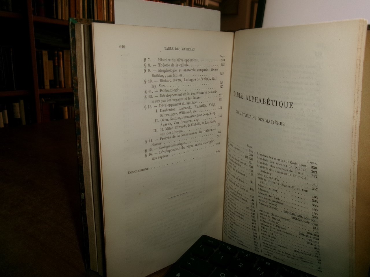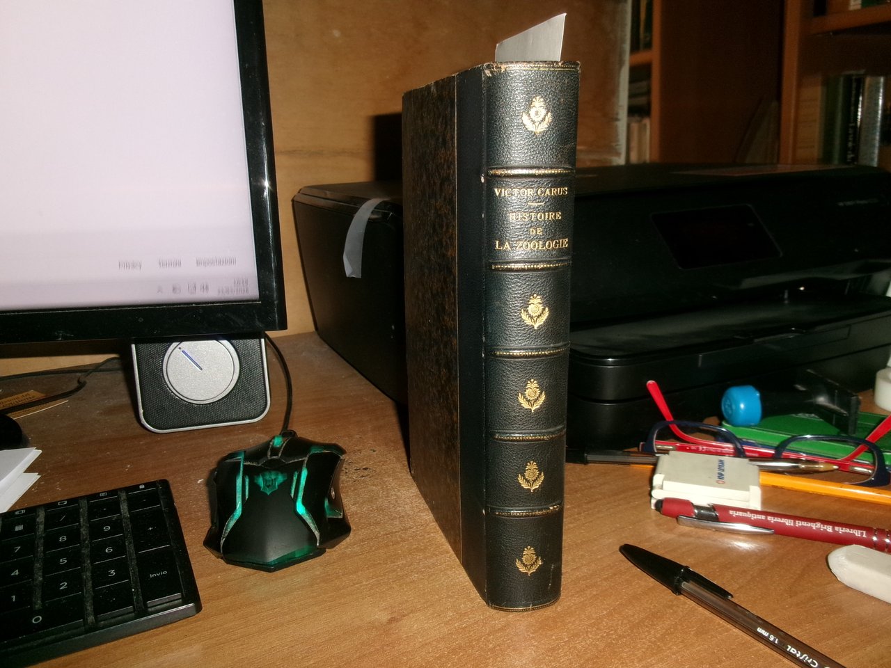 Victor, Carus. Paris, J.-B. Bailière, 1880. HISTOIRE de la Zoologie depuis l' antiquité jusqu'au XIX Siècle. In-8°, m. pelle coeva con dorso a nervi decorato in oro e segnalibro in cotone. viii, 623, (1) pp. Bell' esemplare con lievi fioriture in poche pagine con testo in francese. Neg. Mass. mob. H - H