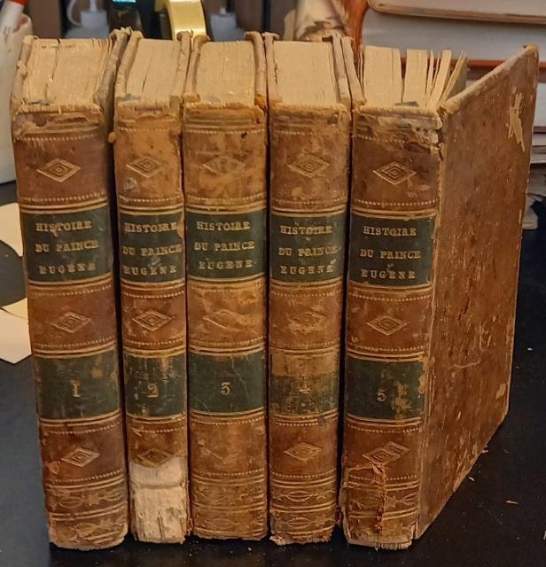Prima edizione. Opera completa in cinque volumi. Testo francese. Cm.14,8x9. Pg.(16), 336; 259, (1); 327, (1); 317, (1); 358. Legature coeve in piena pelle con titoli e fregi in oro ai dorsi. Fogli di guardia marmorizzati. Mancanza ai capitelli inferiori del secondo e del quinto volume. Frontespizi impressi in rosso e nero. Ritratto del principe inciso da Bernigeroth all'antiporta del primo volume. Articolati cartigli calcografici ai frontespizi e all'inizio e alla fine dei testi di ciascun volume, oltre a svariati medaglioni. Con 12 piante ripiegate, finemente incise, raffiguranti: "Plan de la bataille de Zenta", "Plan de la bataille de Chiari"; "Plan de Cremone", "Bataille de Luzara", "Plan de la bataille donnée prés de Hochstet"; "Plan de la bataille de Cassano", "Plan de la Ville de Turin", "Plan de la bataille d'Audenarde"; "Plan de la bataille . de Lille", "Plan de la bataille de Malplaquet"; "Plan de la bataille de Peterwaradin", "Plan de Belgrade". Fresca impressione. Edizione originale della prima esaustiva biografia del condottiero del Sacro Romano Impero il principe Eugenio di Savoia (Paris, 1663-1736), appartenente al ramo cadetto dei Savoia Carignano, una delle principali figure militari del temp. Ne è autore, anche se l'opera è pubblicata in forma anonima, lo storico provenzale Eléazar Mauvillon (1712 - 1779), autore di stimate biografie. L'opera venne ristampata nel 1750, 1755, 1770 e 1790. > Barbier, II, 788. Cioranescu, 44069. Brunet, VI, 8729. Codice libreria 168560.