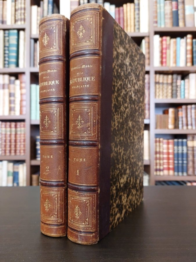 <span style="font-style: normal;">2 volumi in-8° (cm. 26,3), legature coeve in mezza pelle, dorsi a nervi con titoli, filetti e fregi in riquadri in oro (lievissime tracce d'uso), risguardi marmorizzati; pp. VIII 566 [4], [4] 550 [6] in stato molto buono (lievi e sporadiche fioriture). Opera riccamente corredata da eleganti tavole in antiporta finemente incise in rame ad entrambi i volumi, medaglie sempre in rame ai frontespizi, numerose figure in nero nel testo e tavole in rame fuori testo.&nbsp;</span><i>Avec les estampes, costumes, médailles, caricatures, portraits historiés et autographes les plus remarquables du temps. Troisième edition entièrement refondue et considérablement augmentée</i>. Esemplare molto buono. (NE7)