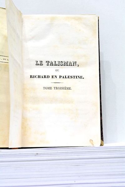 3 tomes : 1). 6 pages non chiffrées + 256 pages 2). 6 pages non chiffrées + 241 pages 3). 4 pages non chiffrées + 264 pages (Seconde Histoire seule) (10x17cm). Demi-cuir ancien. Dos frottés. Pièces de titre et de tomaison en maroquin. Petit défaut au plat supérieur du tome 3. Un feuillet du tome 3, et 2 du tome 1 partiellement déreliés. Roman Historique. Jérusalem. Palestine. Ecosse. Angleterre.