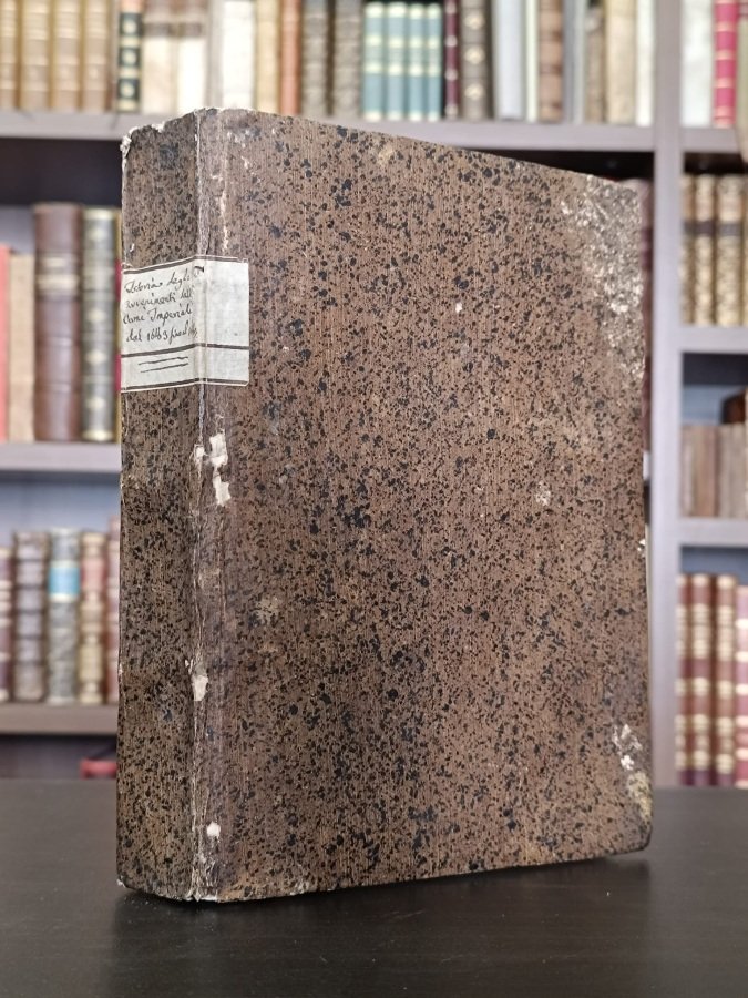 In-4° (cm. 21,8), genuina legatura coeva in cartonato marmorizzato con titolo anticamente manoscritto su tassello al dorso (minime tracce d'uso); pp. [8] 404 [12] con 9 belle tavole in rame più volte ripiegate fuori testo, vignetta con stemma araldico in rame al frontespizio, eleganti testatine, capilettera e finalini xilografici; in buono stato eccetto i soli primi due fascicoli con un'ampia gora al centro. Edizione assai rara, forse la seconda [cfr. Piantanida I, 586]. Affascinante cronaca storica delle guerre turche del 1683-87, arricchita dallo splendido corredo iconografico costituito da tavole e carte geografiche. È dedicata «all'altezza serenissima elettorale di Massimiliano Emanuele duca dell'una e l'altra Baviera» da Giovanni Battista Chiarello, «che in un primo tempo fu creduto l'autore» [ibidem]. «Les planches représentent les siéges de Vienne, Strigau, Neuhaeussel, Cassau, Buda, essek et Erla. Volume assez rare» [Choix 13846]. Cfr. Melzi II, 48. Esemplare più che discreto. (SF2)