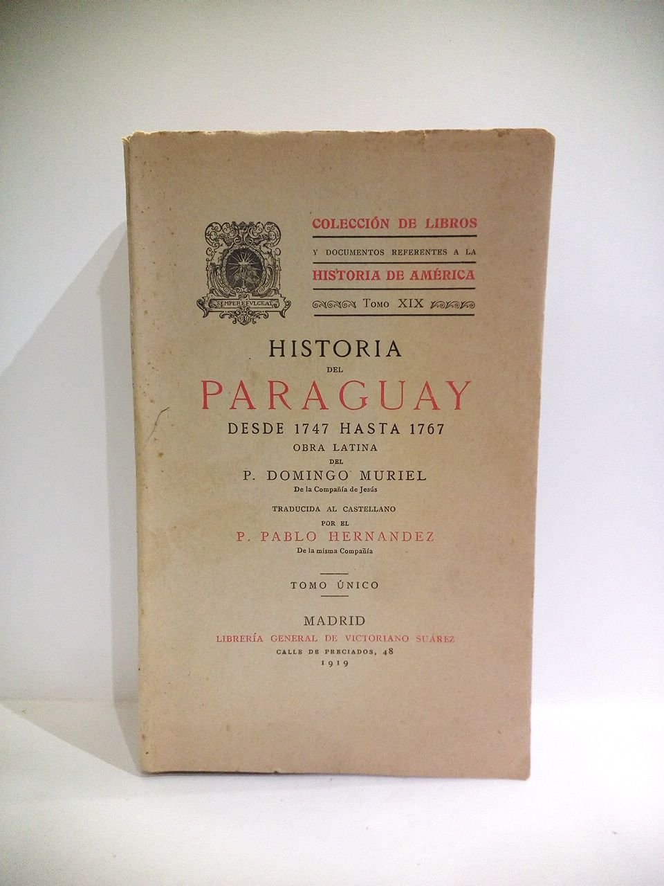 Madrid: Librería General de Victoriano Saárez, 1919.- Tomo único, 659 p., [2 h.]; 4º menor (20,2 x 13,3 cm); Intonso; Rústica Ed.- (Colección de Libros y Documentos Referentes a la Historia de América. Tomo 19).- Este tomo único fue escrito por el Padre Muriel para complementar y finalizar la famosa "Historia del Paraguay" del P. Pedro Francisco Javier Charlevoix, que solo abarcaba hasta el año de 1747. El la continuó hasta la expulsión de la Compañía de Jesús en el año 1767.* En excelente estado de conservación. CONQUISTA, PERIODO VIRREINAL E HISTORIAS GENERALES DE IBEROAMÉRICA