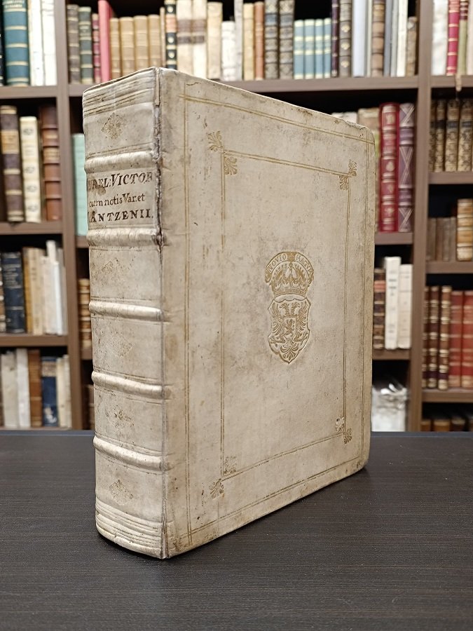 In-4° (cm. 24,9), legatura coeva alle armi in piena pergamena rigida, dorso a nervi con titolo manoscritto, filetti e fregi in oro, piatti inquadrati da ampie cornici in oro con al centro lo stemma della città di Nimega (alcune fioriture e tracce d'uso, usura alla cerniera anteriore); pp. [48] 668 [134 di Index] in stato molto buono (poche brunite, lievi e sporadiche fioriture, fori di tarlo al margine interno senza fastidio al testo, antiporta rifilato); con 1 tavola incisa in rame all'antiporta fuori testo (margine bianco rifilato); vignetta in rame al frontespizio con titoli in rosso e nero; numerosissime medaglie incise in rame nel testo, oltre a testatine, capilettera e finalini xilografici. Bella edizione critica di questa raccolta di opere dello storico romano Aurelio Vittore. Cfr. Schweiger II 1136; Graesse VII, 299; Spoelder 506. Buon esemplare. (NR9)