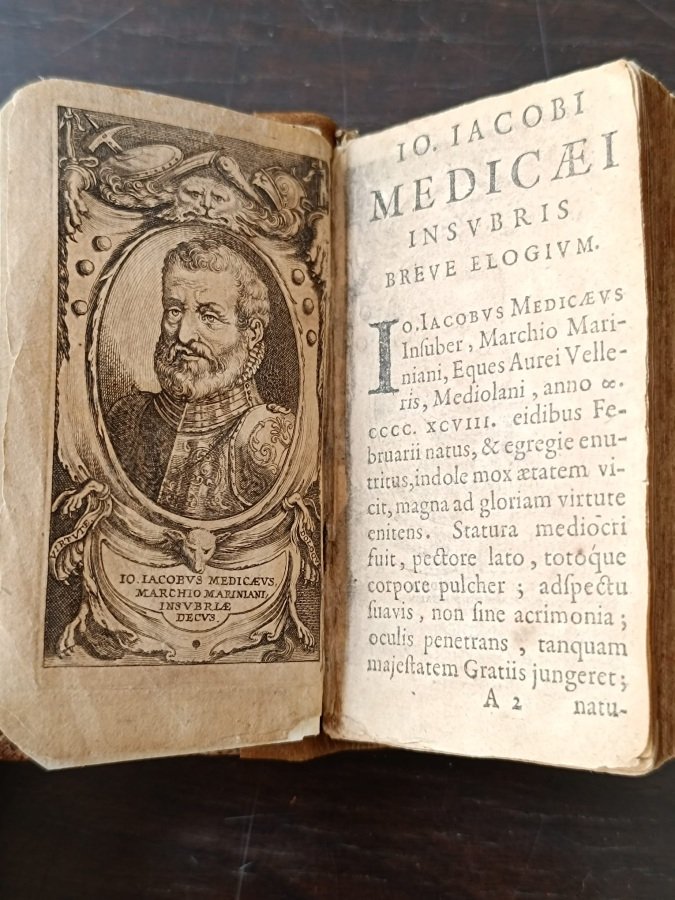 <span style="font-style: normal;">In-24° (cm. 9,8), legatura coeva in piena pelle reindorsata, tagli marmorizzati; pp. [4] 161 [3] in stato molto buono (lievi bruniture); con 1 ritratto in rame di Gian Giacomo de' Medici al verso del frontespizio. Interessante e non comune edizione di queste due opere dedicate alle imprese di Gian Giacomo de' Medici (detto il Medeghino) sul lago di Como e nella guerra di Musso. La prima edizione risale al 1614 in Lovanio, dove l'autore aveva occupato la cattedra di letteratura, in seguito vi fu l'edizione milanese del 1629 dal titolo </span><i>Historiae Cisalpinae</i>. Importante fonte di notizie storiche per questa parte di Lombardia in rara edizione elzeviriana. Marca tipografica al frontespizio e finalino silografico. Buon esemplare. (NQ6)