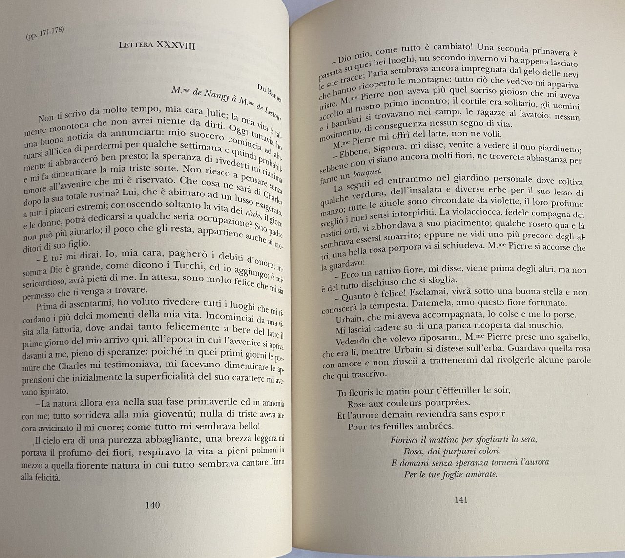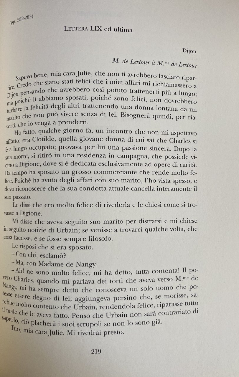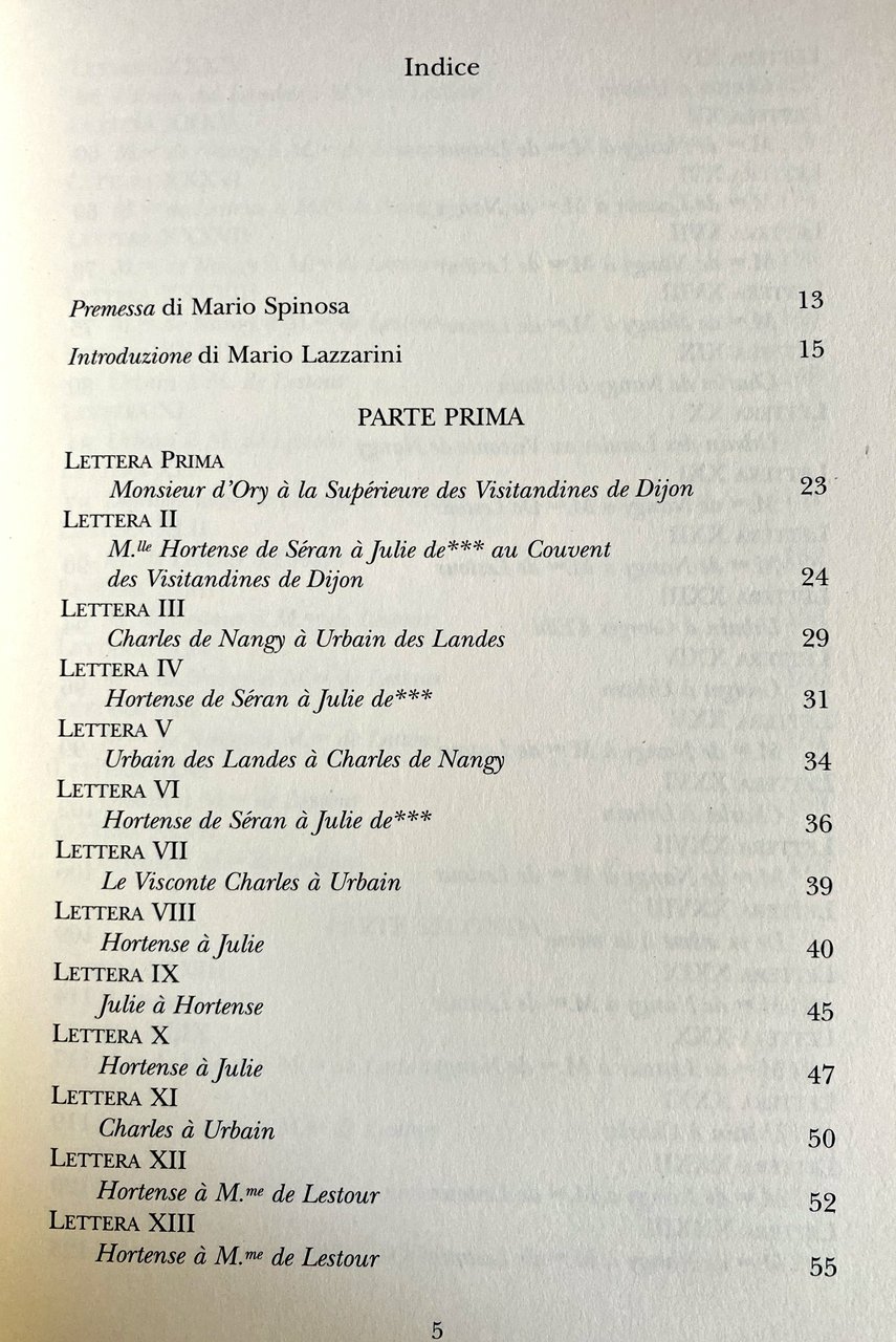 Un romanzo epistolare, scritto dalla principessa di Leporano Caterina Angelica Jourdan, di cui si offrono tutte le informazioni rinvenute attraverso una ricerca tormentata di fonti archivistiche e/o private. La prima parte del libro contiene l'epistolario nella traduzione di Odette Stabile. La seconda parte comprende lo sviluppo delle note sul piano culturale, storico ed autobiografico elaborato dal curatore. Il quale crea tanti personaggi, i narratori epistolari, che nascondono non solo dettagli anagrafici personali e dei propri familiari ma soprattutto il pensiero, il modo di rapportarsi agli altri, la dignità e l'onorabilità.