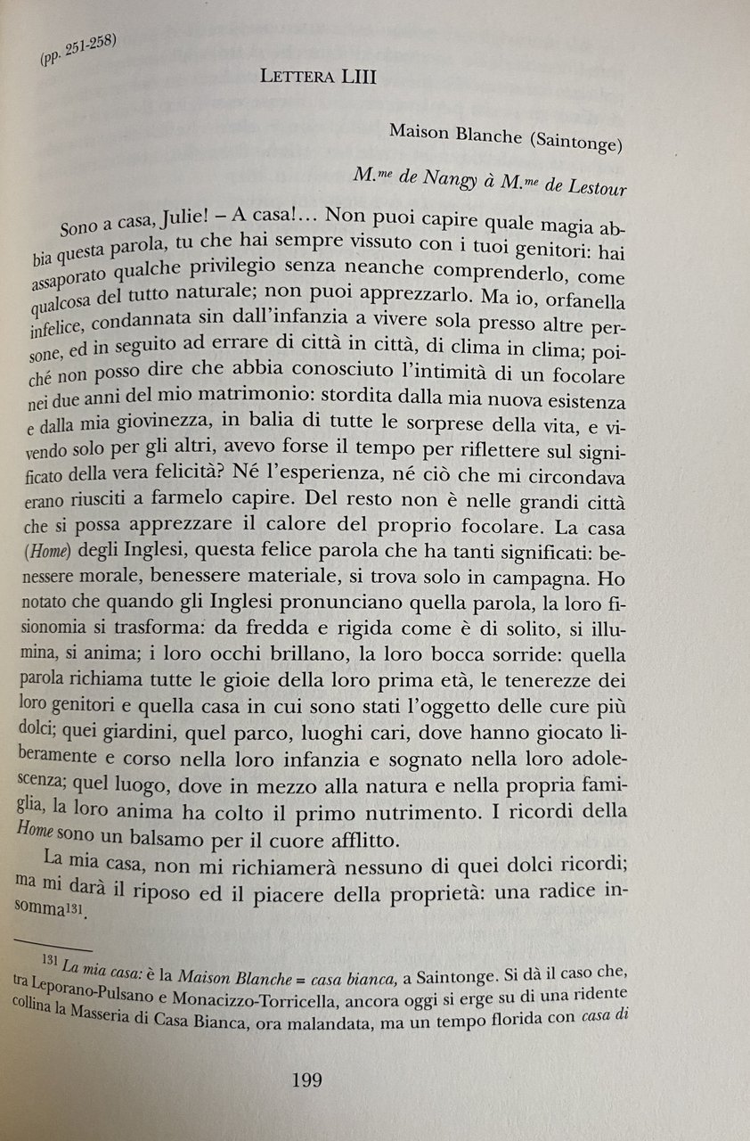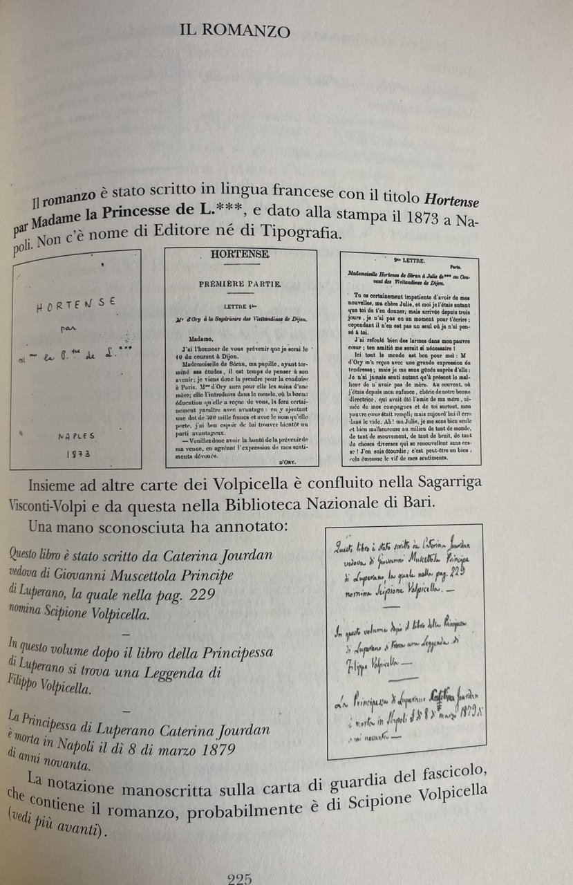 Soggetti: Biografie Memorie Principesse Nobili Nobiltà Calabrese Napoletana Calabria Aristocrazia Romanzi biografici storici Moderna Mercadante Romanzo epistolare Principessa Note culturali storiche autobiografiche Critica letteraria Saggi critici Donne illustri Famiglie nobili Regno di Napoli Archivistica Lettere Corrispondenza Cosimo D'Angela Società Storia Patria Taranto Bibliografia Riferimento Libri rari fuori catalogo illustrati Collezionismo Ricerca Feudatari Pulsano Monacizzo Torricella Documenti Famiglia Successioni Titoli nobiliari Stemmi Araldica Possedimenti Quotidianità Vita quotidiana Vicende Eventi Personaggi Familiari Ottocento Dimora Francia Italia Feudo tarantino Emozioni Sentimenti Ricordi Descrizioni Rievocazioni Epidemia Castello Orazione funebre Casimir Dozin Giovanbattista Muscettola Principe Jean-Baptiste Puglia Culturale Digione Parigi Marsiglia Bari Hortense de Séran Julie Charles de Nangy Urbain des Landes Religiose Superiora Visitandine Cavone Centro storico Inventario Patrimonio immobiliare Case Dimore Marianna Margherita Palazzo Cellamare Chiaia Poesie Pervinca Rosa Amore Convento santa Maria Abolizione Decime Battezzati Chiesa ricettizia Francesco I Guglielmo il Conquistatore Metternich I Paria Sansone Valentina Talleyrand Jean Baptiste Jourdan Directoire Bernadotte Joseph Bonapart Bonaparte Occupazione Rivoluzione francese Partenopea Martiri Repubblica Joachim Murat Borbone Musicisti napoletani Vincenzo Bellini Norma Feudi de Lestour Georges d'Elbé de Forly Datazione Scrittrici Protagonisti Convitto d'Ory Léonie Mons. de Grigoux Conte Clothilde Matrimonio Fedra Ippolito Galatea Pigmalione Re Mida Orfeo Euridice Oreste Pilade Pandora Arianna Figure femminili Poeti Mary Anne Chaworth Dante Beatrice Petrarca Laura Tasso Eleonora Goethe Musa Chateubriand René Gilbert Au banquet de la vie Madameme de Staël Racine Les Plaideurs Cellini Saliera Rarraello Le Vergini Carmagnola La Fontaine I due piccioni I due topi la volpe e l'uovo Samuel Richardson Modello letterario Lovelace Clarissa Harlow Personalità Dinamiche relazionali Defoe Pamela Successo Gusto Pubblico Individualismo passionale Intimità Regole Terza persona Scrittura Sentimentalismo Romanticismo Realismo Confessione de Maintenon Sablière Mademoiselle Montpensier Turenne Ultime lettere di Jacopo Ortis Poesia La feuille Antoine-Vincent Arnault Giacomo Leopardi Infelicità delle cose Mitologia Niobe Aretusa Ninfe Artemide Afrodite Lord Byron Shelley Keats Borghesia Influenze letterarie Rousseau Vergine Gotico Eloisa Saint-Preux Heloise Scipione Volpicella Camilla Marsiconovo Ottoboni Boncompagni Mastrilli Caracciolo Benedetto Croce Eugenio Scacchi Fausto Nicolini Gaetano Filangieri Giuseppe De Blasiis Michelangelo Schipa Montemayor Ruggiero Bonghi Deputazioni Torraca Villari Zazo Andrea Vaccaro Cappella Carafa Costanza Dipinti Fedele Fischetti Ferdinando Fuga Vanvitelli Filiasi Giardino Nola Giovinazzo Maggiorasco Palma d'Artois Pisani Francavilla Stigliano Villa Prunas Serra Regia Antonio Tomai Baronale Demanio Domenico Paladini Giannone Grottaglie Massaria Picerno Pulisano Sammartino Terra Otranto Tomaj Tramontana Trappeto Vassalli Narrativa Letteratura storica Biographies Memoirs Princesses Nobles Nobility Calabrian Neapolitan Aristocracy Historical biographical novels Modern Epistolary novel Princess Cultural notes autobiographical Literary criticism Critical essays Illustrious women Families Kingdom of Naples Archival science Letters Correspondence Society History Homeland Bibliography Reference Rare books out of print illustrated Collecting Research Feudatories Documents Family Successions Noble titles Coats of arms Heraldry Possessions Daily life Events Characters Nineteenth century Home France Italy Fiefdom Emotions Feelings Memories Descriptions Recollections Epidemics Castle Funeral oration Prince Dijon Paris Marseille Religious Superior Historic center Inventory Real estate assets Houses Residences Poems Rose Love Convent Abolition Tithes Baptized Receptive Church Francis I William the Conqueror Occupation French Revolution Parthenopean Martyrs Bourbon Republic Musicians Fiefdoms Writers Protagonists Boarding school Marriage Phaedra Hippolytus Pygmalion King Midas Orpheus Eurydice Orestes Pylades Ariadne Female figures Poets Muse The Virgins Personality Relational dynamics Success Taste Public Passionate individualism Intimacy Rules Third person Sentimentality Romanticism Realism Confession Poetry Unhappiness Mythology Arethusa Nymphs Artemis Aphrodite Bourgeoisie Influences Gothic Scipio Deputations Chapel Paintings Earth Fiction Literature Visitandines Ronsard