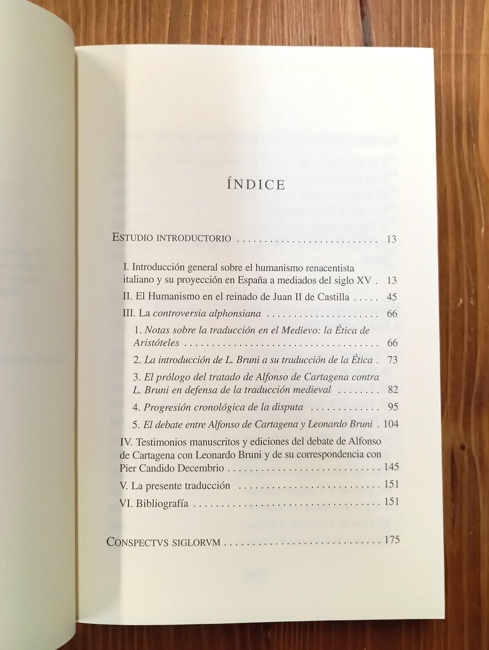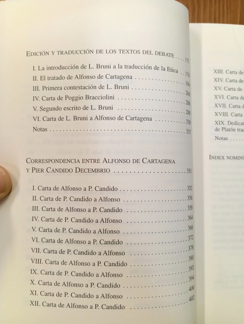 Brossura editoriale di 457 pagine; testi in latino con traduzione spagnola a fronte. Indice consultabile nelle nostre immagini. Leggerissime fioriture al taglio superiore, peraltro copia come nuova, ovvero mai letta -- Las casi 200 páginas introductorias constituyen una historia del humanismo renacentista italiano y su proyección en España a mediados del siglo XV y más concretamente en el reinado de Juan II. El tercer capítulo dedicado a la Controversia alphonsiana analiza los puntos fundamentales: la traducción en el Medievo, la introducción de Bruni a su traducción de la Ética, el alegato de Cartagena contra Bruni en defensa de la traducción medieval, la progresión cronológica de la disputa, el debate entre Cartagena y Bruni, los testimonios manuscritos y ediciones del debate (incluida la correspondencia con P. C. Decembrio). La segunda parte del libro comprende la edición crítica y traducción anotada de los seis textos del debate y de las diecinueve cartas cruzadas entre Cartagena y Decembrio. Los índices finales completan el carácter científico de esta aportación a la historia del humanismo.