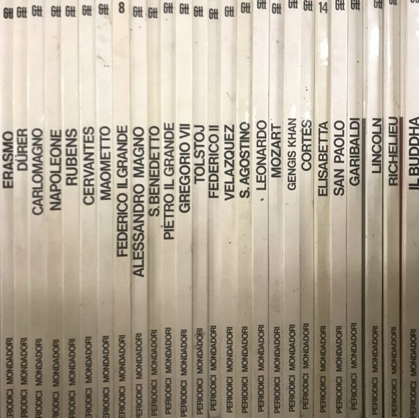 Opera incompleta volumi non numerati della collana Mondadori I Grandi di tutti i tempi, pubblicata a partire dal 1965 con la direzione di Enzo Orlandi. Le monografie presenti; Federico II, Velasquez, S. Agostino, Leonardo, Mozart, Gengis Kahn, Lincoln, Il Buddha, Richelieu, Alessandro, S. Benedetto, Pietro il Grande, Gregorio VII, Tolstoj, CarloMagno, Durer, Erasmo, Napoleone, Rubens, Cervantes, Maometto, Federico il Grande, Elisabetta, San Paolo, Garibaldi, Cortés. Tutti i volumi si presentano in buona conservazione, la copertina in cartoncino rigido a colori lucida, ben conservato il dorso. Le pagine all'interno a colori, con grande fotografie ed illustrazioni. La legatura ben stabile. Numero pagine 75 a volume.