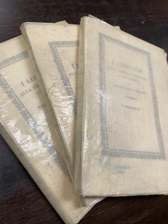 3 volumi in-8° (cm. 22), brossura editoriale (pergamino protettivo); pp. [6] 143, 152, 162 [2] in barbe, con alcune fioriture. Prima edizione del poema nazionale dello scrittore originario di Bellano (Lago di Como), l'opera letteraria con più alta tiratura del tempo (3500 copie) che ispirò, alcuni decenni più tardi, il melodramma omonimo di Giuseppe Verdi. Cfr. Biancardi-Francese 238. Buon esemplare. (Nb6)