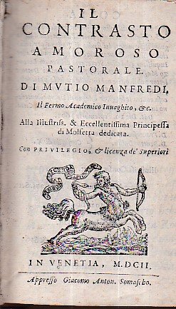 3 opere in un tomo in-8° antico (154x98mm) in legatura settecentesca in piena pergamena rigida con unghie e titolo in oro su tassello al dorso. Ex-libris ottocentesco di Lord Farnham. Esemplare lievemente corto di margini e con qualche lieve fioritura, ma in ottimo stato. Comprende: 1) Agnolo Firenzuola, I Lucidi, cit., ff. 44. Imprese tipografiche al frontespizio e al colophon. Seconda edizione, curata da Lodovico Domenichi e più corretta rispetto alla prima del 1549, sempre impressa dai Giunti. Dell'edizione fu fatta una contraffazione napoletana settecentesca con le note tipografiche: 'Già in Firenze, appresso i Giunti, 1552'. Gamba, 458: 'Suol tenersi in maggiore stima questa ristampa si per la leggiadria de' carratteri, che per la diligenza nella correzione'. Adams, F-496. 2) Muzio Manfredi, Il Contrasto Amoroso Pastorale. In Venetia, appresso Giacomo Anton. Somascho, 1602, pp. (16), 144, (2). Impresa tipografica al frontespizio. Errata all'ultima carta. Prima edizione, rara. Muzio Manfredi (Cesena, 1535 ca.-Roma, 1609), di nobile famiglia ravennate. Membro, con il nome di 'Il Fermo', dell'Accademia degli Innominati di Parma, dell'Accademia degli Invaghiti di Ferrara, di quella dei Confusi di Bologna e dell'Accademia Olimpica, lasciò svariate raccolte di madrigali e rime in vario metro. 3) Tiberio Lunardi, Il servo fedele. Comedia nuova. In Vinegia, presso Altobello Salicato, 1600, cc. 30 [su 32; il testo della commedia è tuttavia completo;la carta 7 è erroneamente numerata 5]. Terza edizione, dopo le due dello stesso Salicato risalenti al 1586 e al 1597. Adams, L-1718. Michel & Michel, V, p. 70.