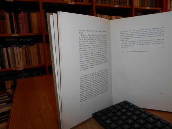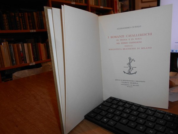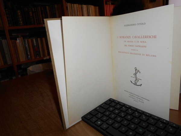 Alessandro Cutolo. Milano, Ulrico Hoepli, 1944. I romanzi cavallereschi in prosa e in rima del fondo Castiglioni presso la Biblioteca Braidense di Milano. In-8°, tela con titolo in oro entro tassello al dorso, copertine originali conservate. vii, 122 pp. con XII tavole n.t. Perfetto esemplare in legatura recente con le copertine originali conservate. Neg. Hoepli mob. 19
