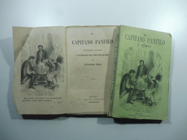 2 voll. in 16 (cm 10 x 16), pp. 123 + (1); 124 + 34-46 (di catalogo editoriale). Brossura editoriale illustrata. Alcune pagine tendono a staccarsi dalla legatura. Il piatto anteriore del I volume e' parzialmente mancante e reintegrato con carta coeva. Prima traduzione italiana del romanzo di Dumas. Un aneddoto letterario famoso riguardante la paternita' di questo libro si lega alla figura dello scrittore George Simenon. Questi racconta nel libro autobiografico 'Pedigree' che fu licenziato dalla libreria nella quale stava lavorando perche' contraddisse il suo principale di fronte ad una cliente. Simenon disse che 'Il capitano Panfilo' era di Dumas, mentre il suo principale era in disaccordo. Una cliente smenti' il principale dando ragione al commesso che venne quindi licenziato. Non datato ma 1865/70 circa.