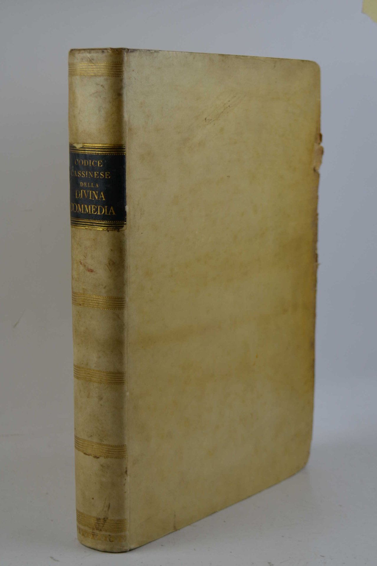 Cm. 38, pp. (8) lv (1) 592 + (2) contenente l'elenco degli associati. Con ritratto di Dante applicato all'antiporta e 6 tavole f.t. raffigurante gli originali ms. Solida legatura coeva in piena pergamena rigida, dorso liscio con filetti decorativi e titoli in oro su tassello. Una sbucciatura al bordo di una parte del piatto anteriore (non grave), qualche piccola macchietta sparsa, peraltro esemplare marginoso ed in ottimo stato di conservazione. Cfr. Mambelli (345): "Il codice ms. cassinese è un volume. assai ricco di commenti e chiose latine e fu ritenuto non solo un documento archeologico, ma anche un monumento d'arte. L'edizione, oggi assai rara, fu stampata in 200 esemplari".