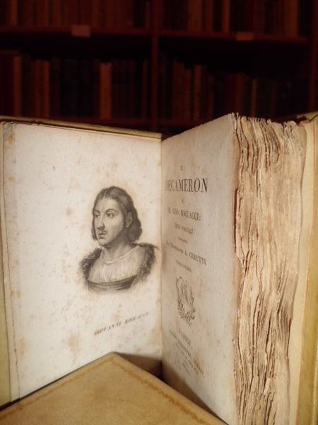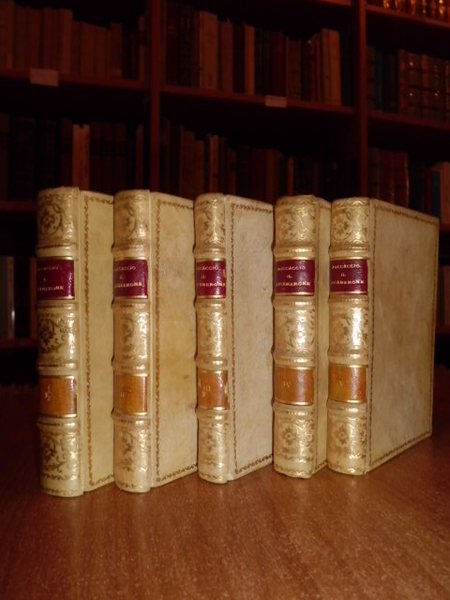 BOCCACCIO, Giovanni. Parigi, presso Malepeyre, 1823 (stamp. Firmin Didot). Il Decameron. Testo Poggiali ricorretto dal Professore A. Cerutti. 5 volumi in - 32°, pergamena ottocentesca, dorsi a nervi con tassello e fregi in oro, filetto aureo sui piani. xxix, (3), 343 pp. e ritratto del B.; (4), 324 pp.; (4), 217 pp.; (4), 294 pp.; (4), 282 pp. Bell' esemplare intonso con testimoni; carta con lievi rifioriture. Bacchi della Lega, Edizione delle opere di G. Boccaccio, p. 57 - 58. Passano, Novelliri, I, p. 100. Zambrini, Opere volgari a stampa. pp. 116 - 17. Uff. Mob. 2