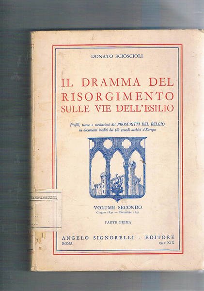 Il dramma del risorgimento sulle vie dell'esilio. Vol. 2° parte prima giu. 130-dic. 1840. Profili trame e rivelazioni dei proscriti del Belgio. | Libri antichi e moderni | Scioscioli Donato.