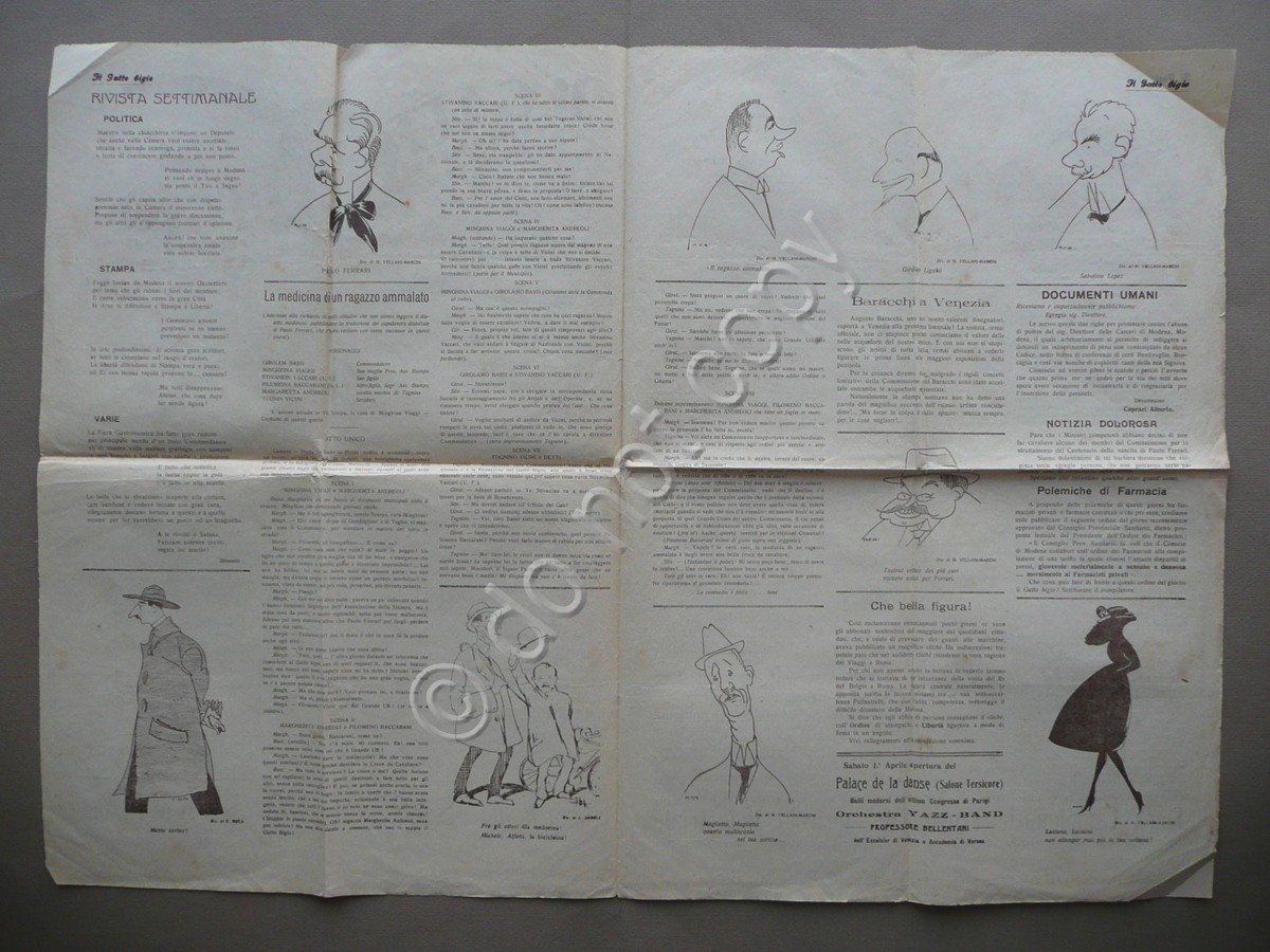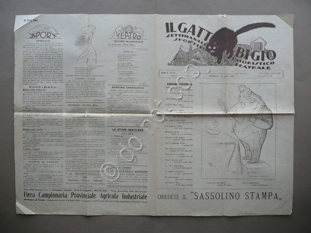 Settimanale, Il Gatto Bigio" settimanale umoristico sportivo teatrale Anno II - N.14 Modena - 8 Aprile 1922 1922, cm 50x35,5, pp. 4 (bifolio) con alcuni disegni di Tirelli, Vellani-Marchi, Zoboli e Rota in monocromia nel testo. Numero completo. Condizioni di conservazione Esemplare in buone condizioni con tracce d'uso, pieghe di conservazione, piccole leggerissime bruniture, angoli con pieghette, alcuni margini con pochi minimi strappetti. Alcuni bei disegni in monocromia nel testo, realizzati da Tirelli, Vellani-Marchi, Zoboli e Rota. SC03.D9114 N "