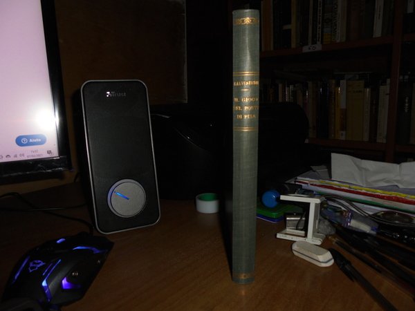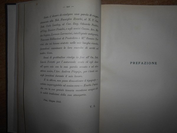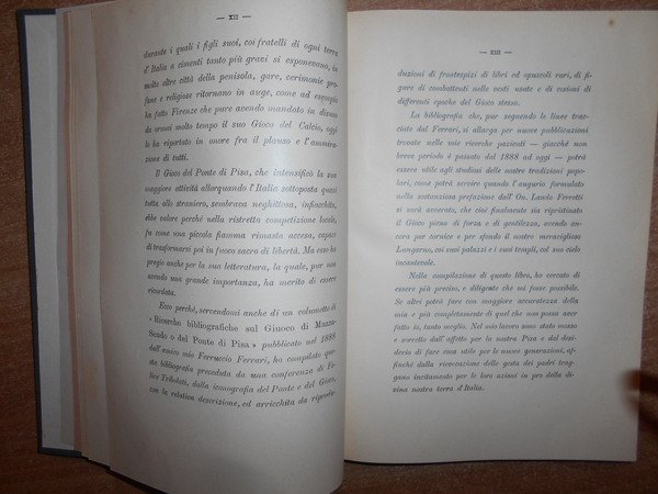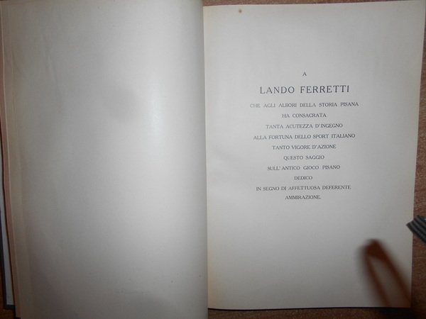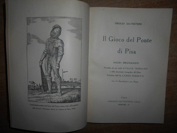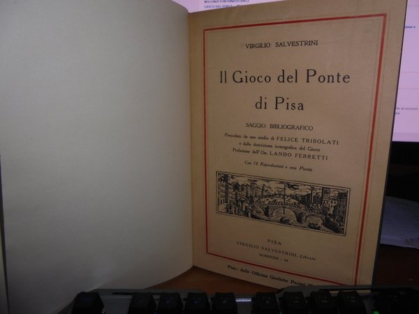 VIRGILIO SALVESTRINI. Pisa, Virgilio Salvestrini Libraio, 1933. Il GIOCO DEL PONTE DI PISA. Saggio Bibliografico. In-8°, tela con fregi e titolo in oro al dorso, copertine originali conservate. LXIII, (4), 201, (1) pp. indice con 16 riproduzioni e una Pianta. SAGGIO BIBLIOGRAFICO PRECEDUTO DA UNO STUDIO DI FELICE TRIBOLATI E DALLA DESCRIZIONE ICONOGRAFICA DEL GIOCO. PREFAZIONE DELL' ON. LANDO FERRETTI. Ottimo esemplare in legatura recente con le copertine originali conservate. Neg. UTET. mob. M